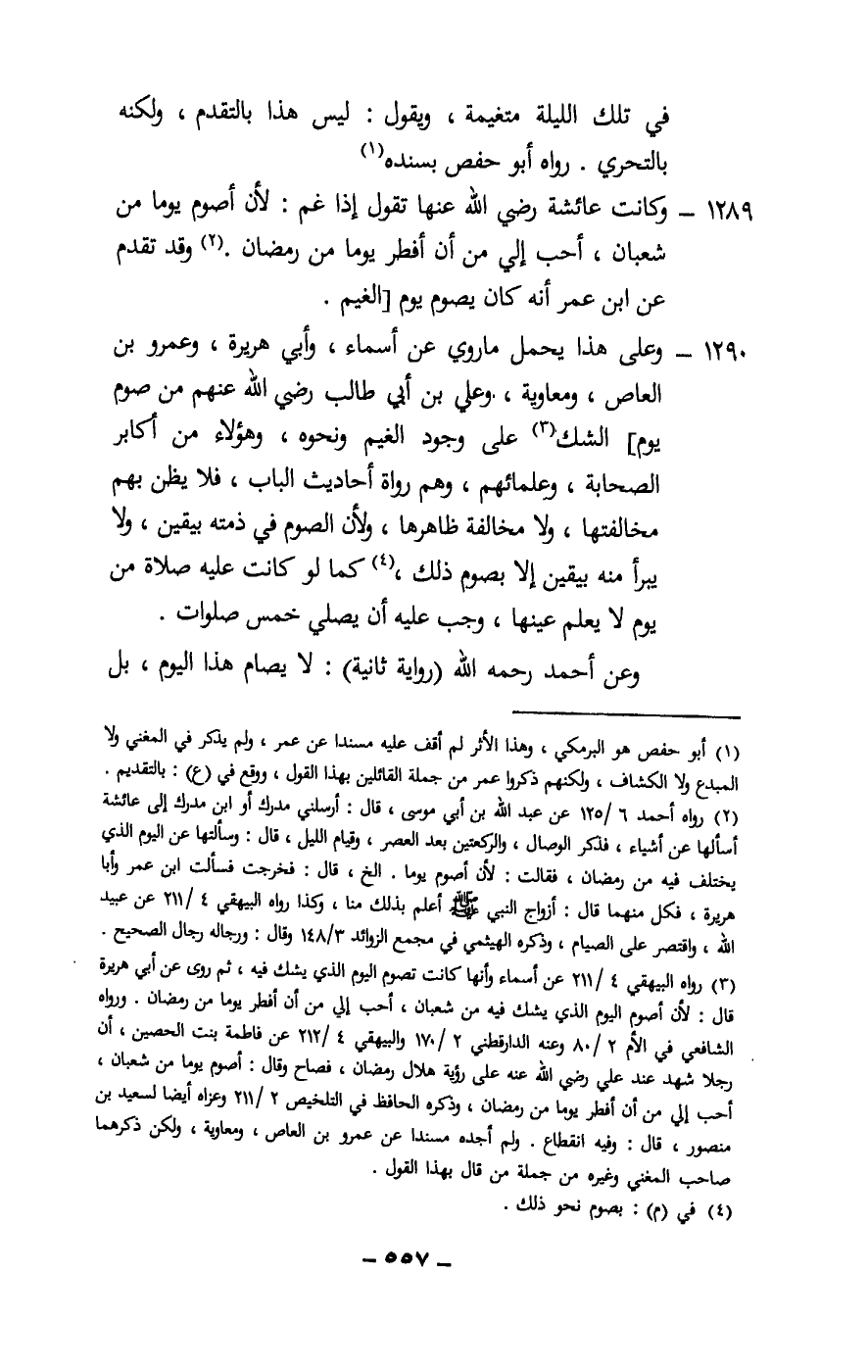 1290 - وعلى هذا يحمل ما روي عن أسماء، وأبي هريرة، وعمرو بن العاص، ومعاوية، وعلي بن أبي طالب - رَضِيَ اللَّهُ عَنْهُمْ - من صوم يوم] الشك على وجود الغيم ونحوه، وهؤلاء من أكابر الصحابة، وعلمائهم، وهم رواة أحاديث الباب، فلا يظن بهم مخالفتها، ولا مخالفة ظاهرها، ولأن الصوم في ذمته بيقين، ولا يبرأ منه بيقين إلا بصوم ذلك، كما لو كانت عليه صلاة من يوم لا يعلم عينها، وجب عليه أن يصلي خمس صلوات.