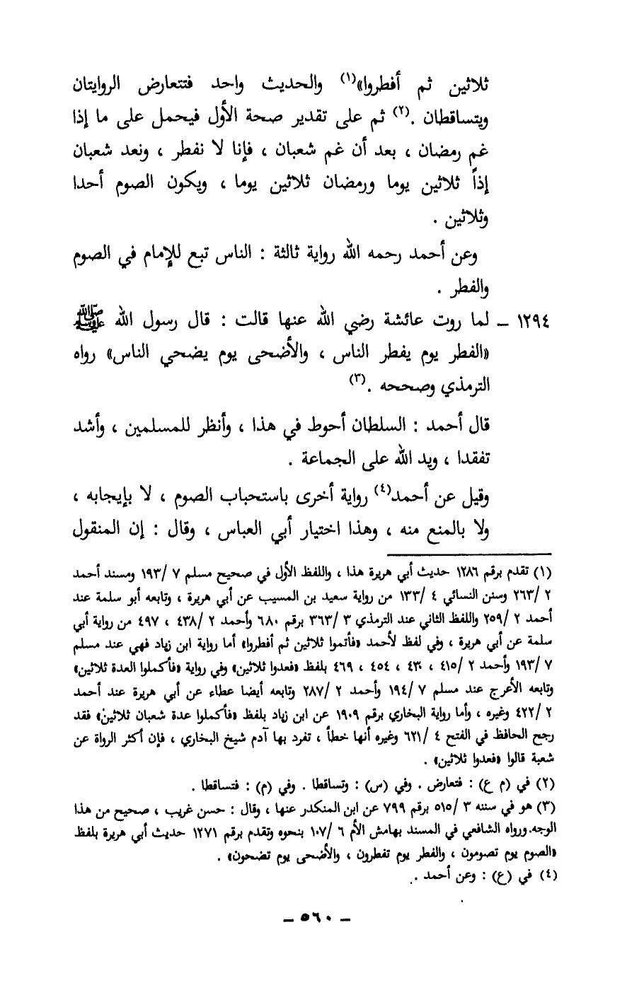 وعن أحمد - رَحِمَهُ اللَّهُ - رواية ثالثة: الناس تبع للإمام في الصوم والفطر.