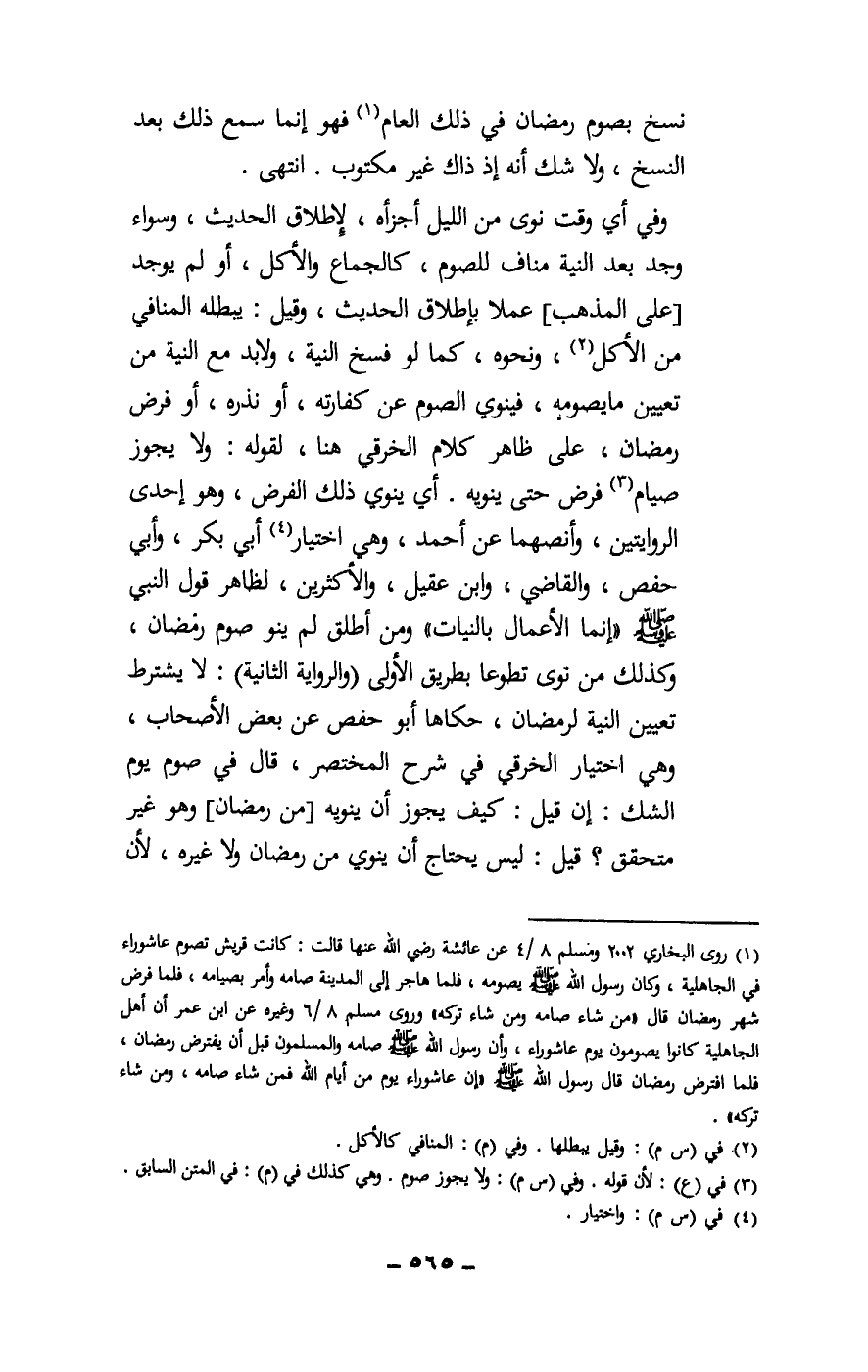 وفي أي وقت نوى من الليل أجزأه، لإطلاق الحديث، وسواء وجد بعد النية مناف للصوم، كالجماع والأكل، أو لم يوجد [على المذهب] عملا بإطلاق الحديث، وقيل: يبطله المنافي من الأكل، ونحوه، كما لو فسخ النية، ولا بد مع النية من تعيين ما يصومه، فينوي الصوم عن كفارته، أو نذره، أو فرض رمضان، على ظاهر كلام الخرقي هنا، لقوله: ولا يجوز صيام فرض حتى ينويه. أي ينوي ذلك الفرض، وهو إحدى الروايتين، وأنصهما عن أحمد، وهي اختيار أبي بكر، وأبي حفص، والقاضي، وابن عقيل، والأكثرين، لظاهر قول النبي - صَلَّى اللَّهُ عَلَيْهِ وَسَلَّمَ -: «إنما الأعمال بالنيات» ومن أطلق لم ينو صوم رمضان، وكذلك من نوى تطوعا بطريق الأولى (والرواية الثانية) : لا يشترط تعيين النية لرمضان، حكاها أبو حفص عن بعض الأصحاب، وهي اختيار الخرقي في شرح المختصر، قال في صوم يوم الشك: إن قيل: كيف يجوز أن ينويه [من رمضان] وهو غير متحقق؟ قيل: ليس يحتاج أن ينوي من رمضان ولا غيره، لأن