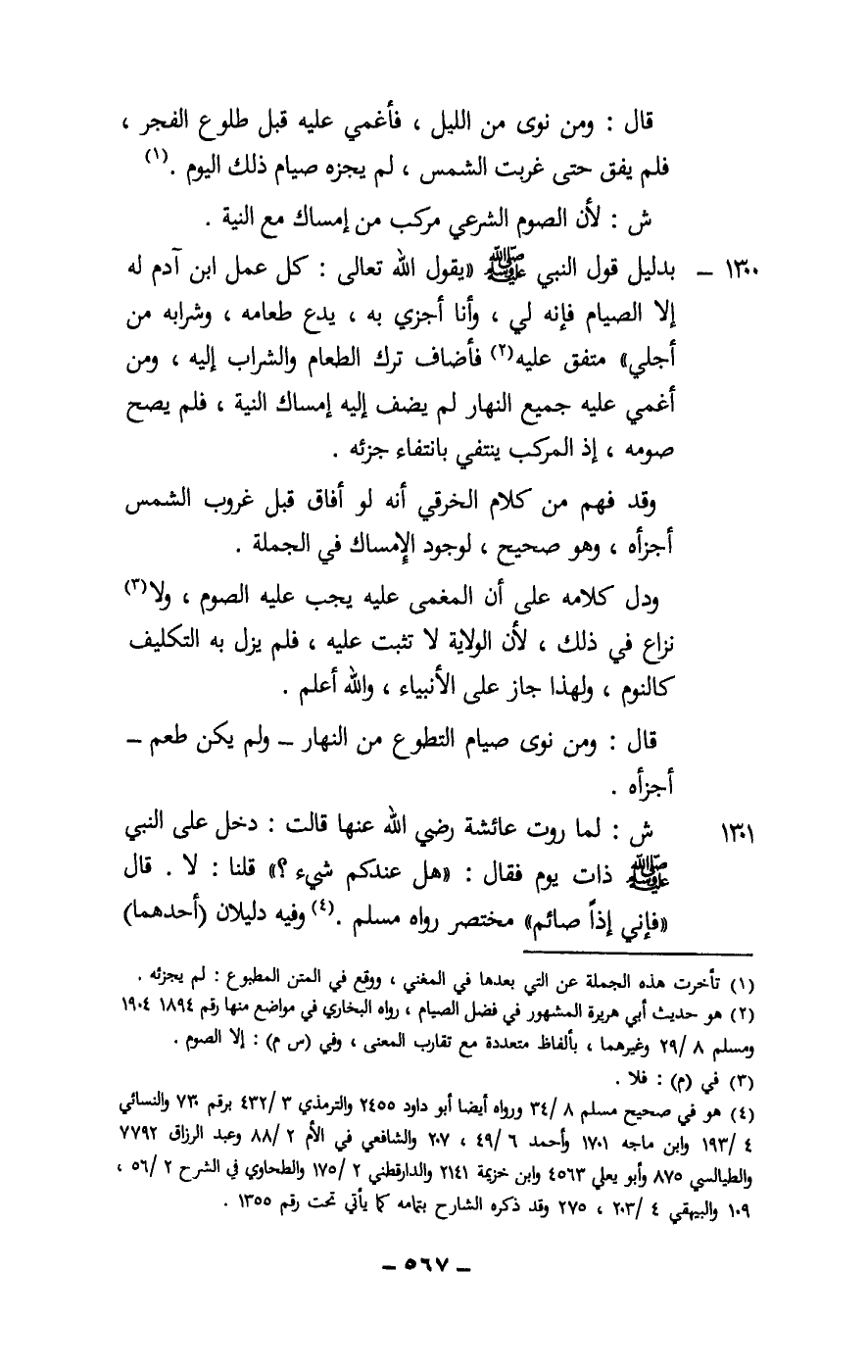 1300 - بدليل قول النبي - صَلَّى اللَّهُ عَلَيْهِ وَسَلَّمَ -: «يقول الله تعالى: كل عمل ابن آدم له إلا الصيام فإنه لي، وأنا أجزي به، يدع طعامه، وشرابه من أجلي» متفق عليه؛ فأضاف ترك الطعام والشراب إليه، ومن أغمي عليه جميع النهار لم يضف إليه إمساك النية، فلم يصح صومه، إذ المركب ينتفي بانتفاء جزئه.