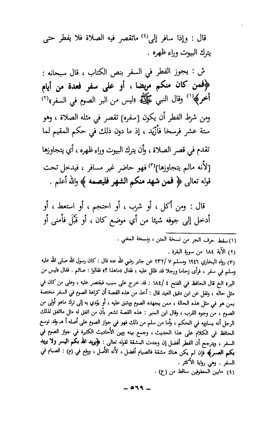 ش: يجوز الفطر في السفر بنص الكتاب، قال سبحانه: {فَمَنْ كَانَ مِنْكُمْ مَرِيضًا أَوْ عَلَى سَفَرٍ فَعِدَّةٌ مِنْ أَيَّامٍ أُخَرَ} [البقرة: 184] وقال النبي - صَلَّى اللَّهُ عَلَيْهِ وَسَلَّمَ -: «ليس من البر الصوم في السفر» . ومن شرط الفطر أن يكون [سفره] تقصر في مثله الصلاة، وهو ستة عشر فرسخا فأزيد، إذ ما دون ذلك في حكم المقيم لما تقدم في قصر الصلاة، وأن يترك البيوت وراء ظهره، أي يتجاوزها [لأنه ما لم يتجاوزها] فهو حاضر غير مسافر، فيدخل تحت قَوْله تَعَالَى: {فَمَنْ شَهِدَ مِنْكُمُ الشَّهْرَ فَلْيَصُمْهُ} [البقرة: 185] والله أعلم.