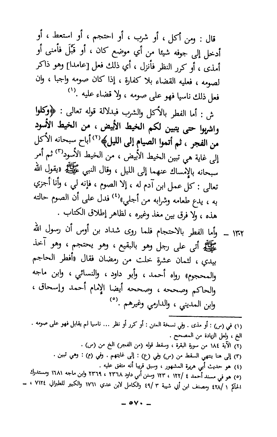 ش: أما الفطر بالأكل والشرب فبدلالة قَوْله تَعَالَى: {وَكُلُوا وَاشْرَبُوا حَتَّى يَتَبَيَّنَ لَكُمُ الْخَيْطُ الْأَبْيَضُ مِنَ الْخَيْطِ الْأَسْوَدِ مِنَ الْفَجْرِ ثُمَّ أَتِمُّوا الصِّيَامَ إِلَى اللَّيْلِ} [البقرة: 187] أباح سبحانه الأكل إلى غاية هي تبين الخيط الأبيض، من الخيط الأسود ثم أمر سبحانه بالإمساك عنهما إلى الليل، وقال النبي - صَلَّى اللَّهُ عَلَيْهِ وَسَلَّمَ -: «يقول الله تعالى: كل عمل ابن آدم له، إلا الصوم، فإنه لي، وأنا أجزي به، يدع طعامه وشرابه من أجلي» ، فدل على أن الصوم حالته هذه، ولا فرق بين مغذ وغيره، لظاهر إطلاق الكتاب.