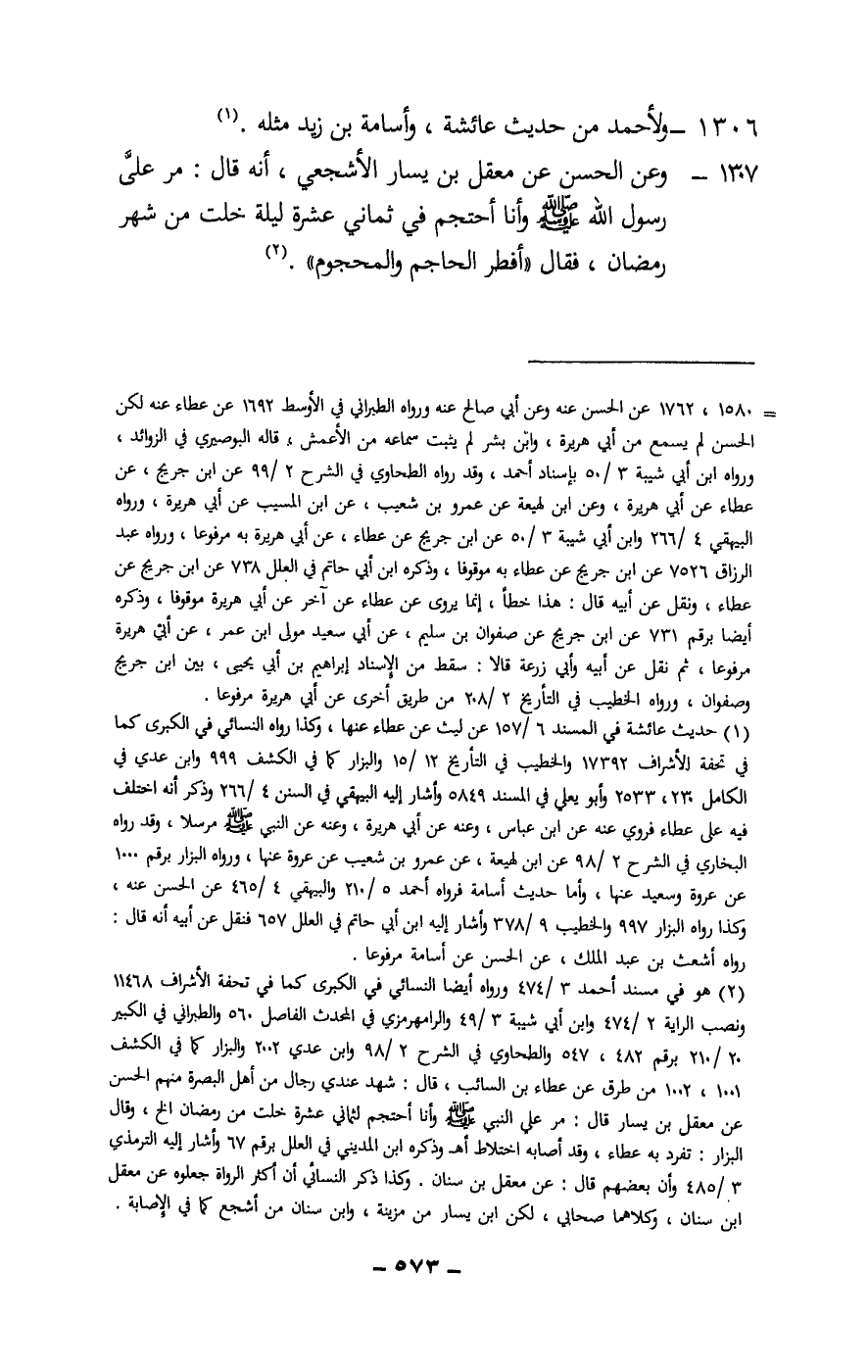 1307 - «وعن الحسن عن معقل بن يسار الأشجعي، أنه قال: مر علي رسول الله - صَلَّى اللَّهُ عَلَيْهِ وَسَلَّمَ - وأنا أحتجم في ثماني عشرة ليلة خلت من شهر رمضان، فقال: «أفطر الحاجم والمحجوم» .
