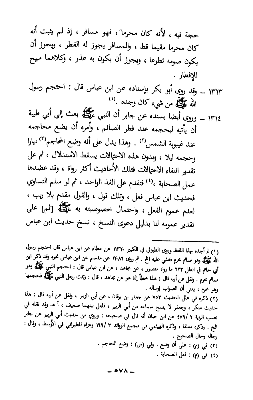 1314 - وروى أيضا بسنده عن جابر «أن النبي - صَلَّى اللَّهُ عَلَيْهِ وَسَلَّمَ - بعث إلى أبي طيبة أن يأتيه ليحجمه عند فطر الصائم، وأمره أن يضع محاجمه عند غيبوبة الشمس» . وهذا يدل على أنه وضع المحاجم نهارا وحجمه ليلا، وبدون هذه الاحتمالات يسقط الاستدلال، ثم على تقدير انتفاء الاحتمالات فتلك الأحاديث أكثر رواة، وقد عضدها عمل الصحابة، فتقدم على الفذ الواحد، ثم لو سلم التساوي فحديث ابن عباس فعل، وتلك قول، والقول مقدم بلا ريب، لعدم عموم الفعل، واحتمال خصوصيته به - صَلَّى اللَّهُ عَلَيْهِ وَسَلَّمَ -[ثم] على تقدير عمومه لنا بدليل دعوى النسخ، نسخ حديث ابن عباس