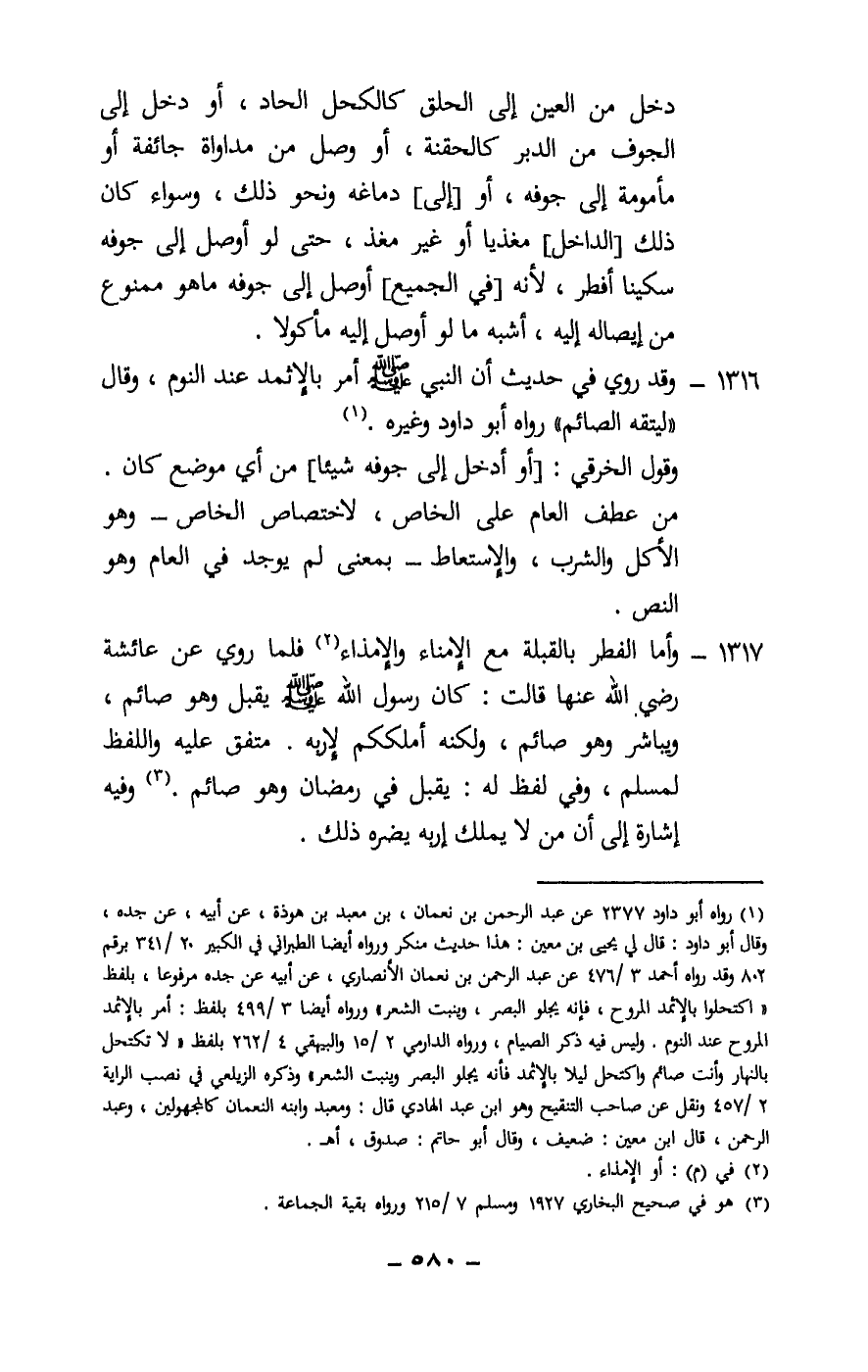 1316 - وقد روي في حديث أن النبي - صَلَّى اللَّهُ عَلَيْهِ وَسَلَّمَ - «أمر بالإثمد عند النوم، وقال: «ليتقه الصائم» رواه أبو داود وغيره.