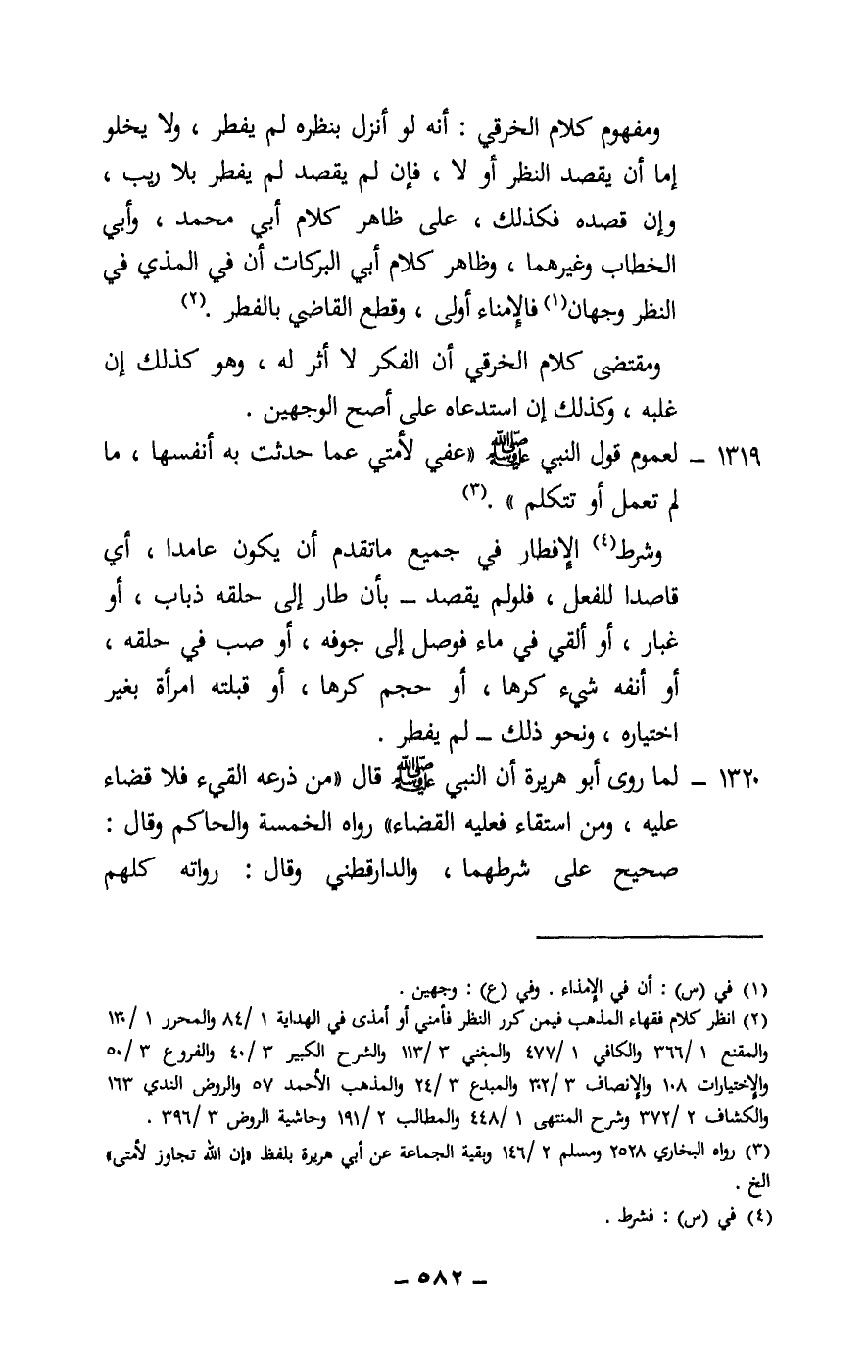 1320 - لما روى أبو هريرة أن النبي - صَلَّى اللَّهُ عَلَيْهِ وَسَلَّمَ - قال: «من ذرعه القيء فلا قضاء عليه، ومن استقاء فعليه القضاء» رواه الخمسة والحاكم وقال: صحيح على شرطهما، والدارقطني وقال: رواته كلهم