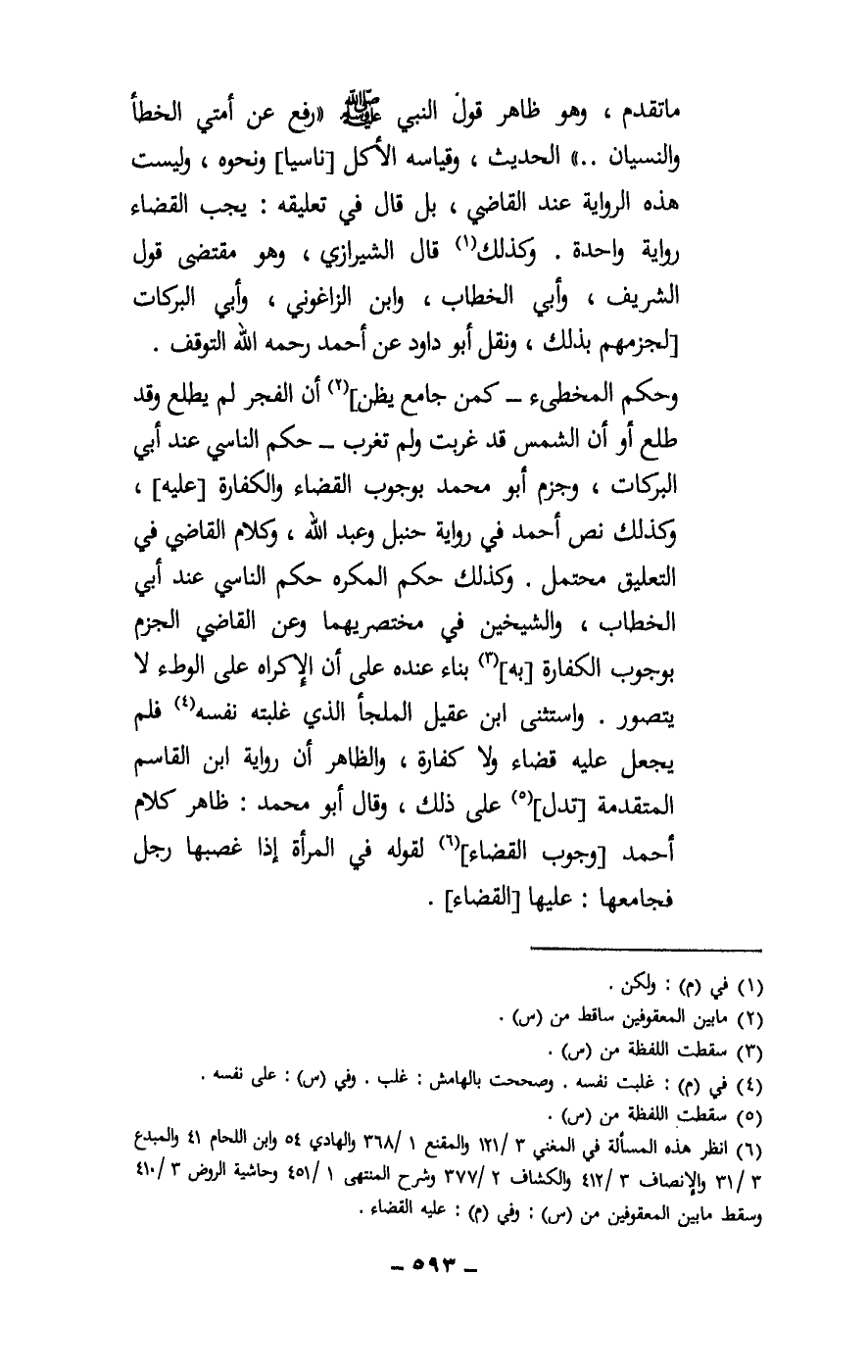 وحكم المخطئ - كمن جامع يظن] أن الفجر لم يطلع وقد طلع أو أن الشمس قد غربت ولم تغرب - حكم الناسي عند أبي البركات، وجزم أبو محمد بوجوب القضاء والكفارة [عليه] ، وكذلك نص أحمد في رواية حنبل وعبد الله، وكلام القاضي في التعليق محتمل. وكذلك حكم المكره حكم الناسي عند أبي الخطاب، والشيخين في مختصريهما، وعن القاضي: الجزم بوجوب الكفارة [به] بناء عنده على أن الإكراه على الوطء لا يتصور. واستثنى ابن عقيل الملجأ الذي غلبته نفسه فلم يجعل عليه قضاء ولا كفارة، والظاهر أن رواية ابن القاسم المتقدمة [تدل] على ذلك، وقال أبو محمد: ظاهر كلام أحمد [وجوب القضاء] لقوله في المرأة إذا غصبها رجل فجامعها: عليها [القضاء] .