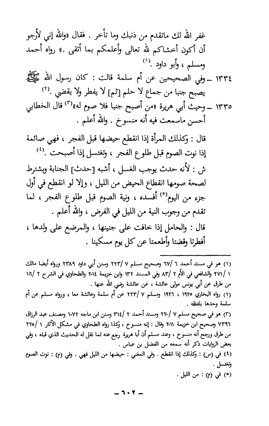 1334 - وفي الصحيحين عن أم سلمة قالت: كان رسول الله - صَلَّى اللَّهُ عَلَيْهِ وَسَلَّمَ - يصبح جنبا من جماع لا حلم [ثم] لا يفطر ولا يقضي.