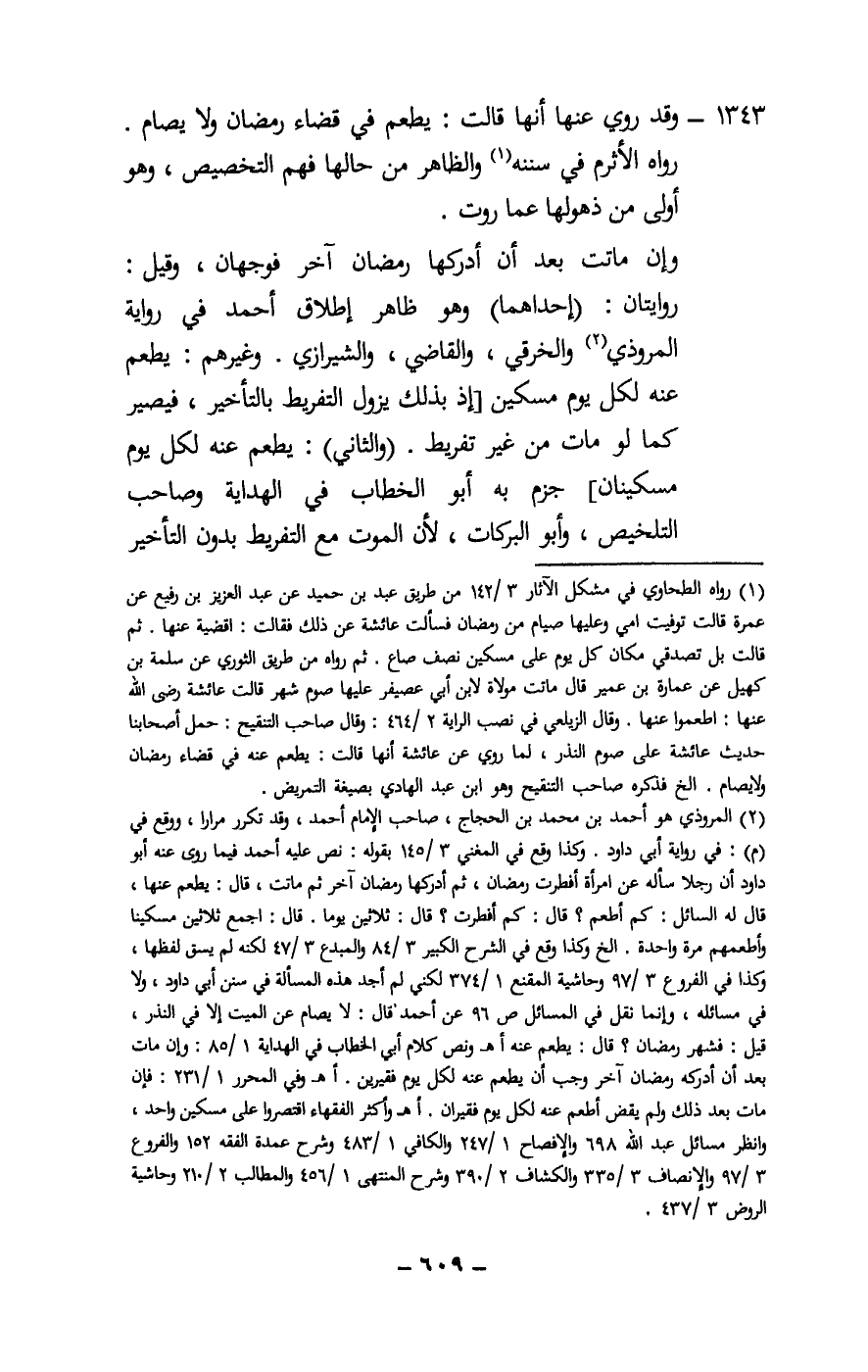 1343 - وقد روي عنها أنها قالت: يطعم في قضاء رمضان ولا يصام. رواه الأثرم في سننه والظاهر من حالها فهم التخصيص، وهو أولى من ذهولها عما روت.