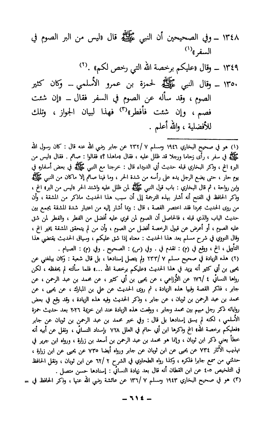 1350 - «وقال النبي - صَلَّى اللَّهُ عَلَيْهِ وَسَلَّمَ - لحمزة بن عمرو الأسلمي - وكان كثير الصوم، وقد سأله عن الصوم في السفر فقال: - «إن شئت فصم، وإن شئت فأفطر» ، فهذا لبيان الجواز، وتلك للأفضلية، والله أعلم.