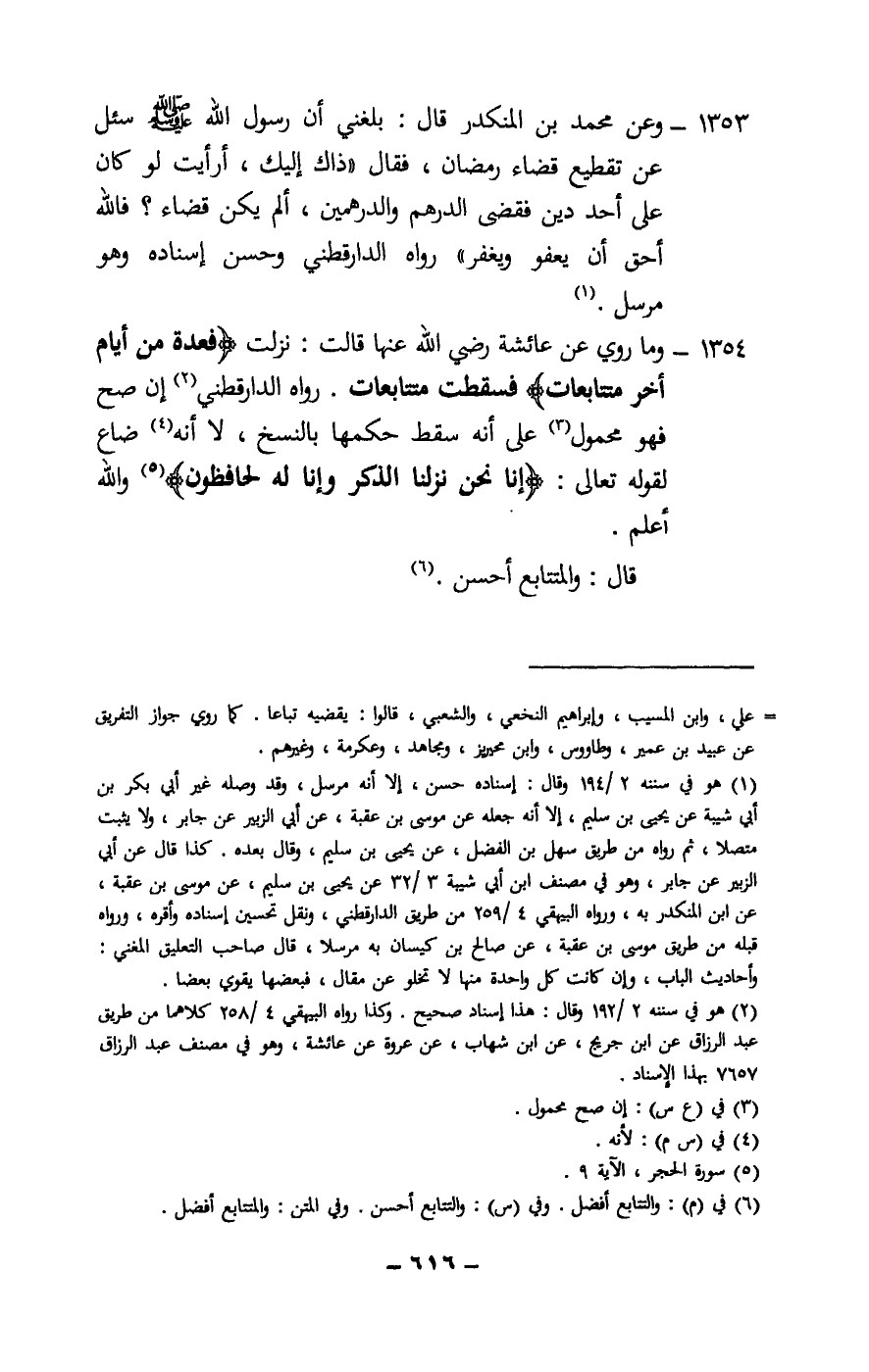 1354 - وما روي عن عائشة - رَضِيَ اللَّهُ عَنْهَا - قالت: نزلت (فعدة من أيام أخر متتابعات) فسقطت متتابعات. رواه الدارقطني إن صح فهو محمول على أنه سقط حكمها بالنسخ، لا أنه ضاع لِقَوْلِهِ تَعَالَى: {إِنَّا نَحْنُ نَزَّلْنَا الذِّكْرَ وَإِنَّا لَهُ لَحَافِظُونَ} [الحجر: 9] والله أعلم.