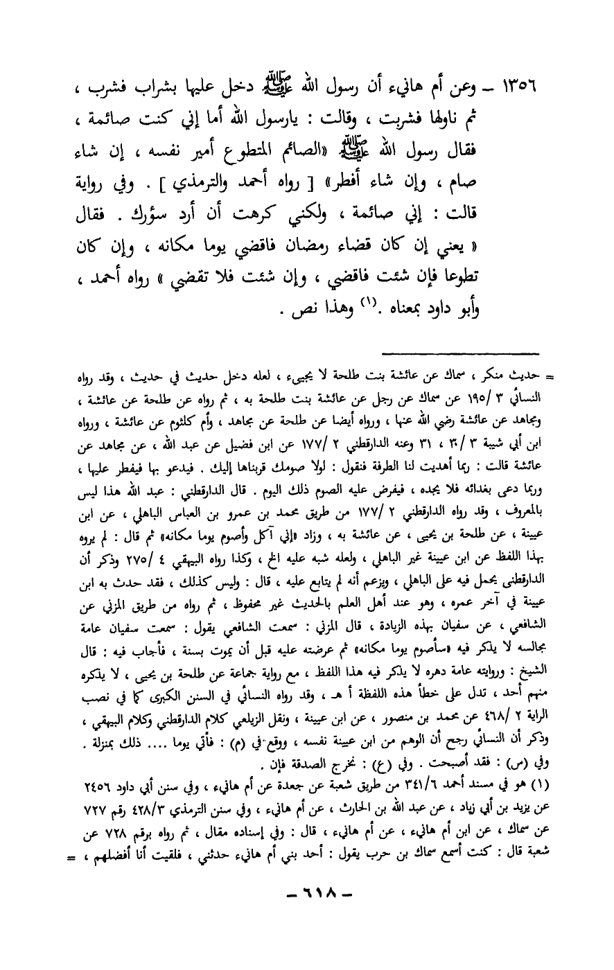 1356 - «وعن أم هانئ أن رسول الله - صَلَّى اللَّهُ عَلَيْهِ وَسَلَّمَ - دخل عليها بشراب فشرب، ثم ناولها فشربت، وقالت: يا رسول الله أما إني كنت صائمة، فقال رسول الله - صَلَّى اللَّهُ عَلَيْهِ وَسَلَّمَ -: «الصائم المتطوع أمير نفسه، إن شاء صام، وإن شاء أفطر» [رواه أحمد والترمذي] . وفي رواية «قالت: إني صائمة، ولكني كرهت أن أرد سؤرك. فقال: «يعني إن كان قضاء رمضان فاقضي يوما مكانه، وإن كان تطوعا فإن شئت فاقضي، وإن شئت فلا تقضي» رواه أحمد، وأبو داود بمعناه. وهذا نص.