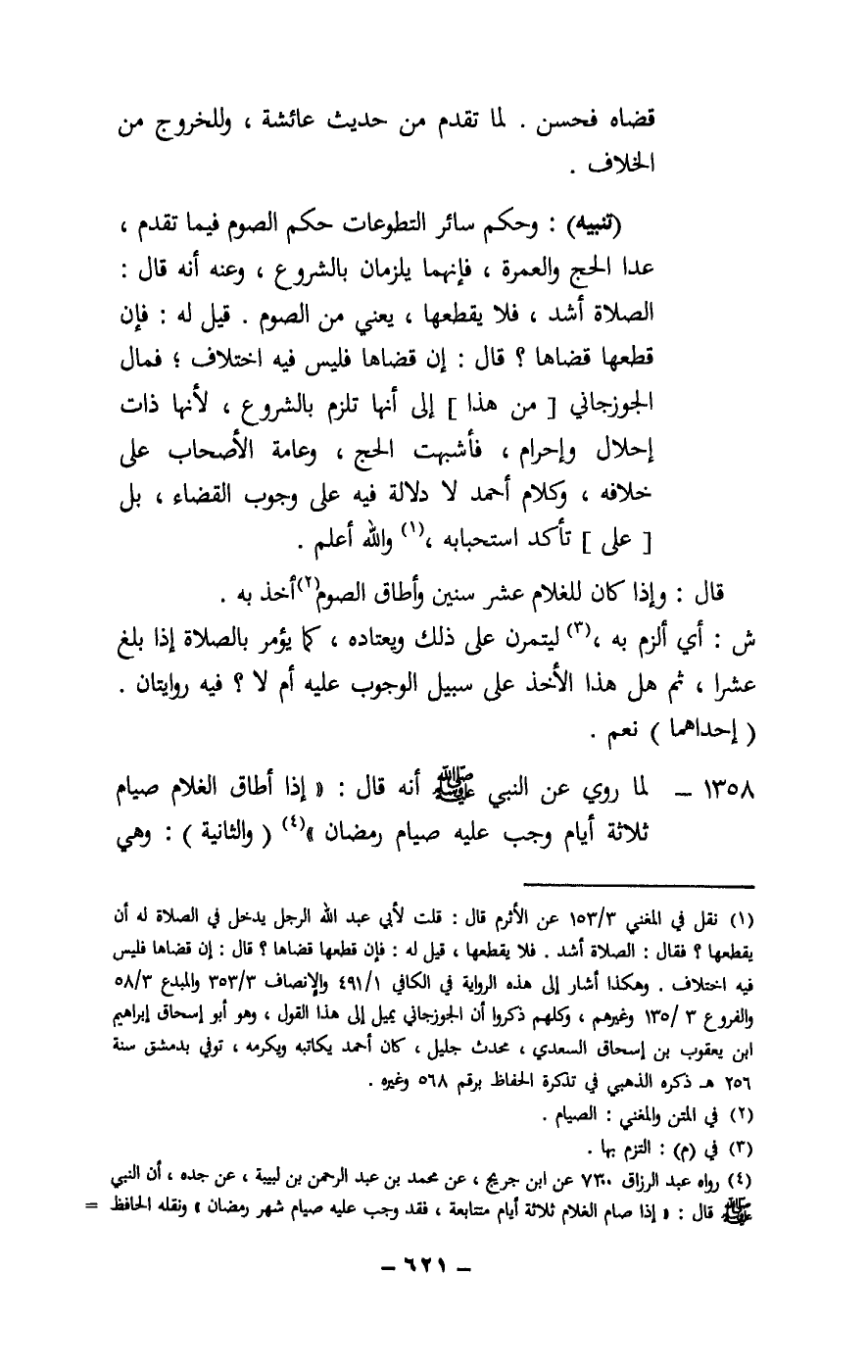 1358 - لما روي عن النبي - صَلَّى اللَّهُ عَلَيْهِ وَسَلَّمَ - أنه قال: «إذا أطاق الغلام صيام ثلاثة أيام وجب عليه صيام رمضان» (والثانية) : وهي