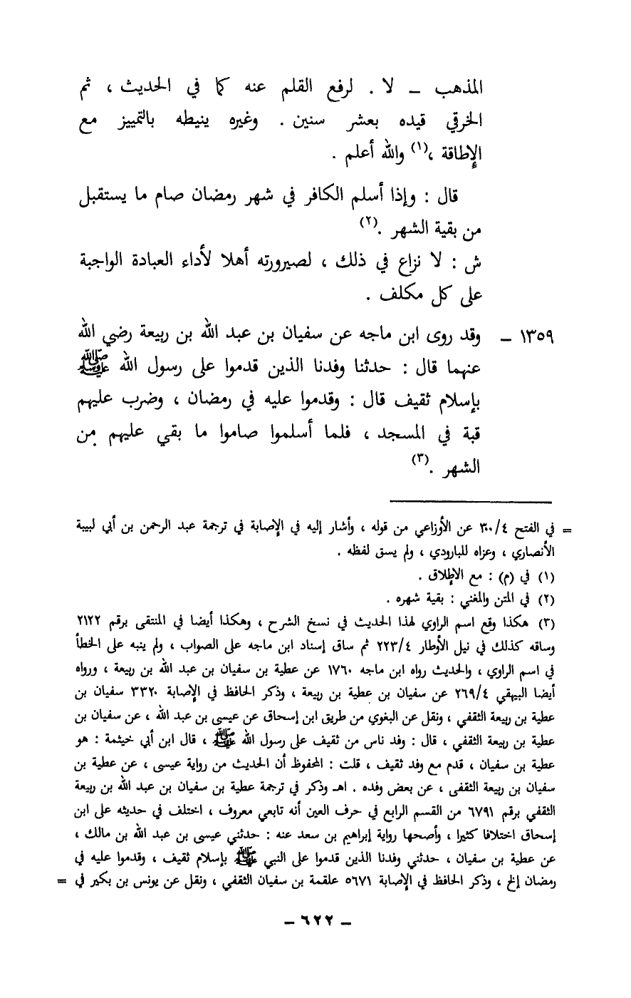 1359 - وقد روى ابن ماجه عن سفيان بن عبد الله بن ربيعة - رَضِيَ اللَّهُ عَنْهُمَا - قال: «حدثنا وفدنا الذين قدموا على رسول الله - صَلَّى اللَّهُ عَلَيْهِ وَسَلَّمَ - بإسلام ثقيف قال: وقدموا عليه في رمضان، وضرب عليهم قبة في المسجد، فلما أسلموا صاموا ما بقي عليهم من الشهر» .