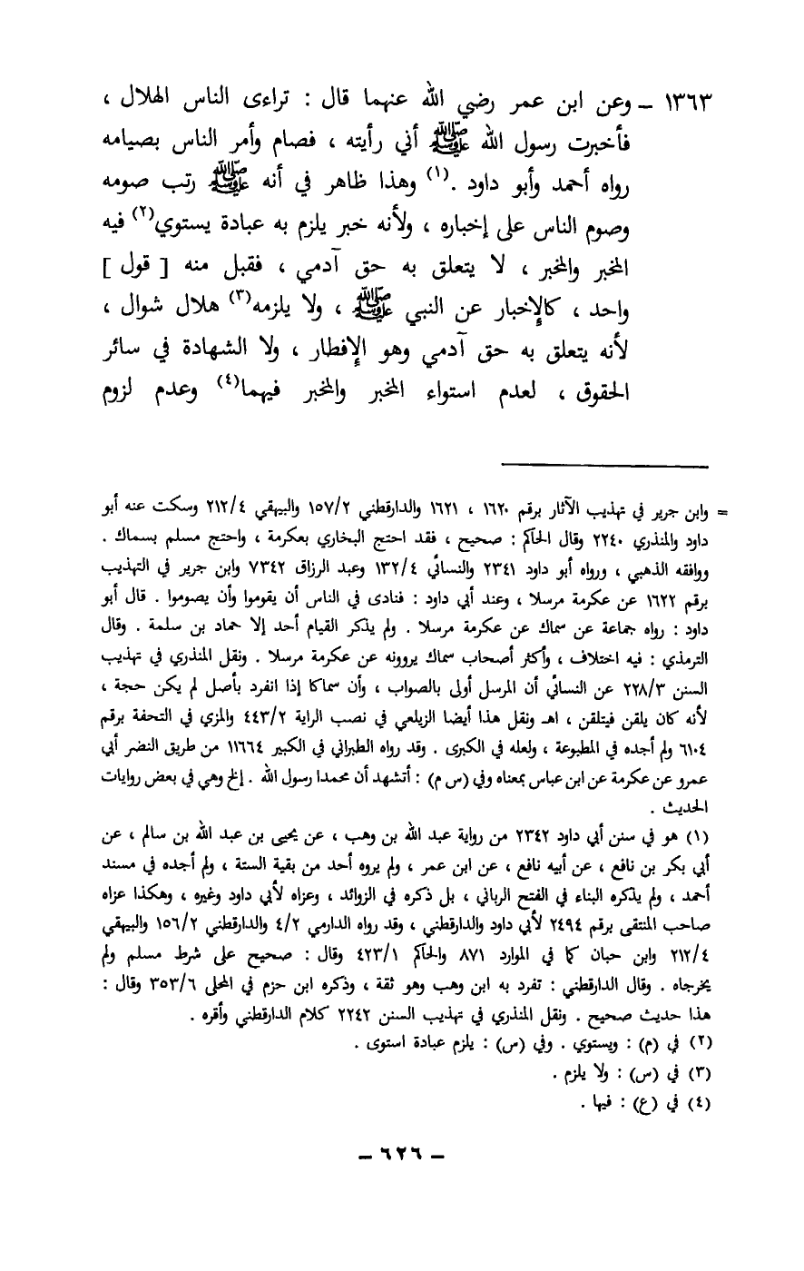 1363 - «وعن ابن عمر - رَضِيَ اللَّهُ عَنْهُمَا - قال: تراءى الناس الهلال، فأخبرت رسول الله - صَلَّى اللَّهُ عَلَيْهِ وَسَلَّمَ - أني رأيته، فصام وأمر الناس بصيامه» رواه أحمد وأبو داود. وهذا ظاهر في أنه - صَلَّى اللَّهُ عَلَيْهِ وَسَلَّمَ - رتب صومه وصوم الناس على إخباره، ولأنه خبر يلزم به عبادة يستوي فيه المخبر والمخبر، لا يتعلق به حق آدمي، فقبل منه [قول] واحد، كالإخبار عن النبي - صَلَّى اللَّهُ عَلَيْهِ وَسَلَّمَ - ولا يلزمه هلال شوال، لأنه يتعلق به حق آدمي وهو الإفطار، ولا الشهادة في سائر الحقوق، لعدم استواء المخبر والمخبر فيهما وعدم لزوم