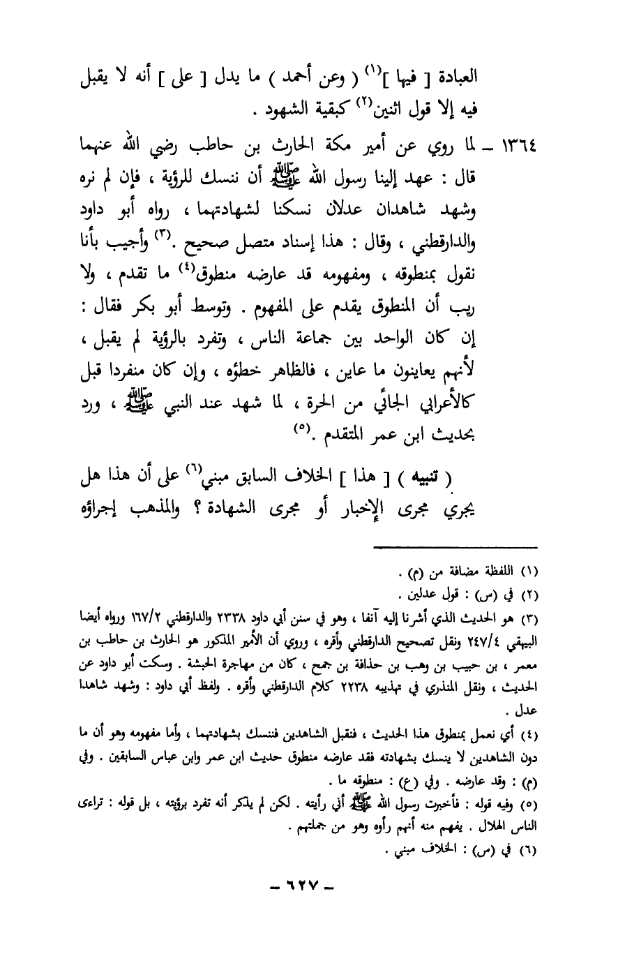 1364 - لما روي عن أمير مكة الحارث بن حاطب - رَضِيَ اللَّهُ عَنْهُمَا - قال: «عهد إلينا رسول الله - صَلَّى اللَّهُ عَلَيْهِ وَسَلَّمَ - أن ننسك للرؤية، فإن لم نره وشهد شاهدان عدلان نسكنا لشهادتهما» ، رواه أبو داود والدارقطني، وقال: هذا إسناد متصل صحيح. وأجيب بأنا نقول بمنطوقه، ومفهومه قد عارضه منطوق ما تقدم، ولا ريب أن المنطوق يقدم على المفهوم. وتوسط أبو بكر فقال: إن كان الواحد بين جماعة الناس، وتفرد بالرؤية لم يقبل، لأنهم يعاينون ما عاين، فالظاهر خطؤه، وإن كان منفردا قبل كالأعرابي الجائي من الحرة، لما شهد عند النبي - صَلَّى اللَّهُ عَلَيْهِ وَسَلَّمَ - ورد بحديث ابن عمر المتقدم.