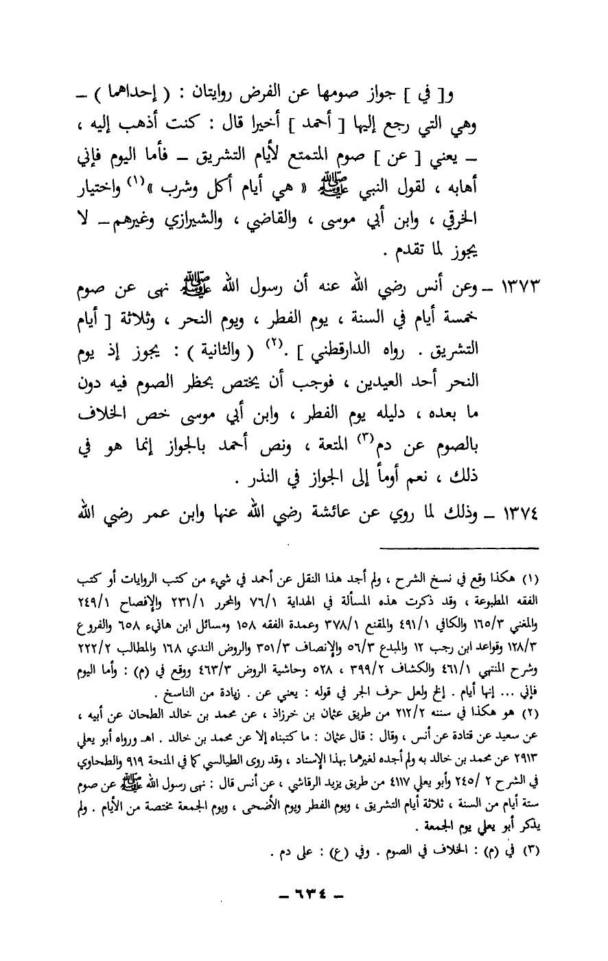 1373 - وعن أنس - رَضِيَ اللَّهُ عَنْهُ - «أن رسول الله - صَلَّى اللَّهُ عَلَيْهِ وَسَلَّمَ - نهى عن صوم خمسة أيام في السنة، يوم الفطر، ويوم النحر، وثلاثة [أيام التشريق» . رواه الدارقطني] . (والثانية) : يجوز إذ يوم النحر أحد العيدين، فوجب أن يختص بحظر الصوم فيه دون ما بعده، دليله يوم الفطر، وابن أبي موسى خص الخلاف بالصوم عن دم المتعة، ونص أحمد بالجواز إنما هو في ذلك، نعم أومأ إلى الجواز في النذر.