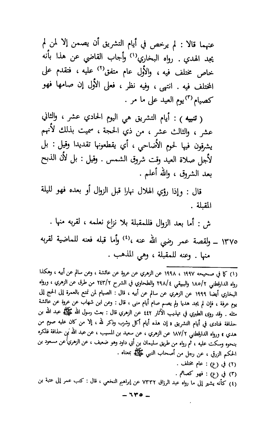 عنهما قالا: لم يرخص في أيام التشريق أن يصمن إلا لمن لم يجد الهدي. رواه البخاري وأجاب القاضي عن هذا بأنه خاص مختلف فيه، والأول عام متفق عليه، فتقدم على المختلف فيه. انتهى، وفيه نظر، فعلى الأول إن صامها فهو كصيام يوم العيد على ما مر.