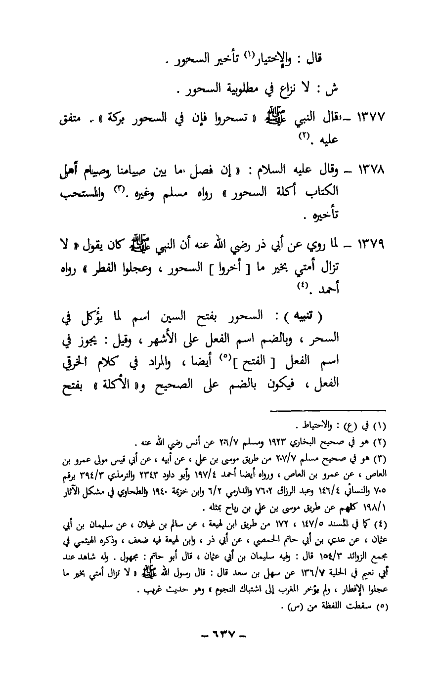1378 - وقال - عَلَيْهِ السَّلَامُ -: «إن فصل ما بين صيامنا وصيام أهل الكتاب أكلة السحور» رواه مسلم وغيره. والمستحب تأخيره.
