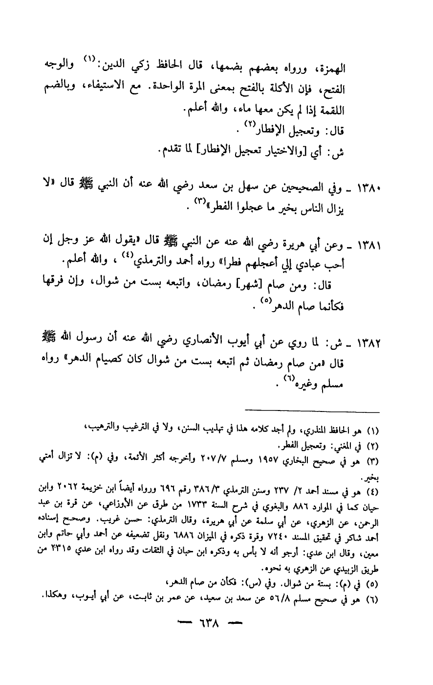 1380 - وفي الصحيحين عن سهل بن سعد - رَضِيَ اللَّهُ عَنْهُ - أن النبي - صَلَّى اللَّهُ عَلَيْهِ وَسَلَّمَ - قال: «لا يزال الناس بخير ما عجلوا الفطر» .