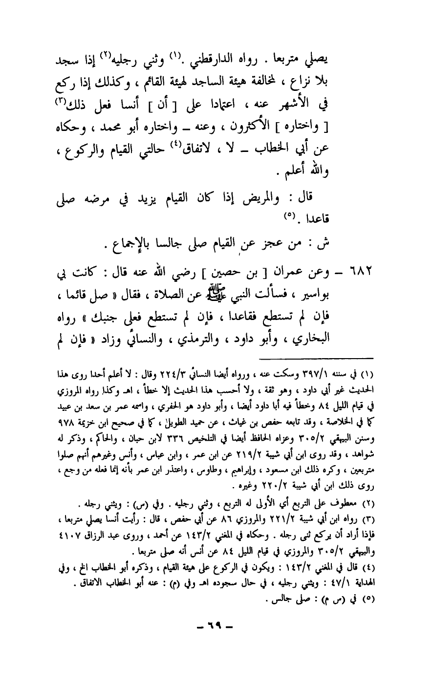682 - «وعن عمران بن حصين]- رَضِيَ اللَّهُ عَنْهُ -، قال: كانت بي بواسير، فسألت النبي - صَلَّى اللَّهُ عَلَيْهِ وَسَلَّمَ - عن الصلاة، فقال: «صل قائما، فإن لم تستطع فقاعدا، فإن لم تستطع فعلى جنبك» رواه البخاري، وأبو داود، والترمذي، والنسائي وزاد «فإن لم