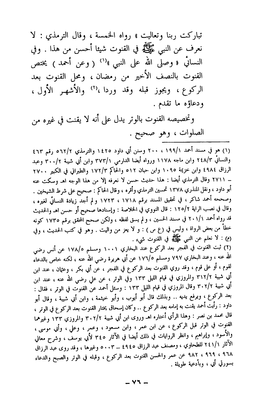 تباركت ربنا وتعاليت» رواه الخمسة، وقال الترمذي: لا نعرف عن النبي - صَلَّى اللَّهُ عَلَيْهِ وَسَلَّمَ - في القنوت شيئا أحسن من هذا. وفي النسائي «وصلى الله على النبي» ، (وعن أحمد) يختص القنوت بالنصف الأخير من رمضان، ومحل القنوت بعد الركوع، ويجوز قبله وقد وردا، والأشهر الأول، ودعاؤه ما تقدم.