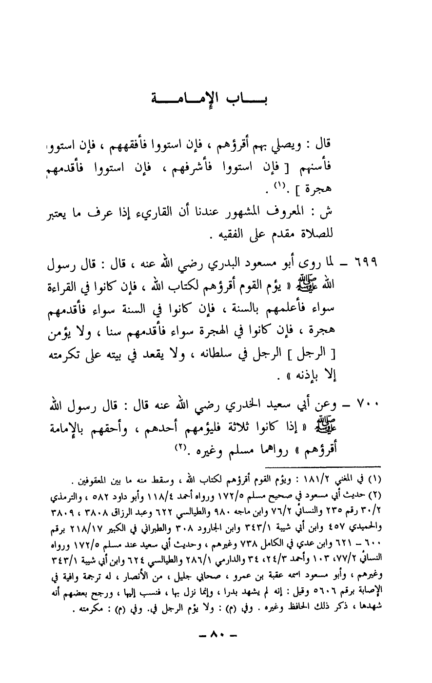 699 - لما روى أبو مسعود البدري - رَضِيَ اللَّهُ عَنْهُ -، قال: قال رسول الله - صَلَّى اللَّهُ عَلَيْهِ وَسَلَّمَ -: «يؤم القوم أقرؤهم لكتاب الله، فإن كانوا في القراءة سواء فأعلمهم بالسنة، فإن كانوا في السنة سواء فأقدمهم هجرة، فإن كانوا في الهجرة سواء فأقدمهم سنا، ولا يؤمن [الرجل] الرجل في سلطانه، ولا يقعد في بيته على تكرمته إلا بإذنه» .
