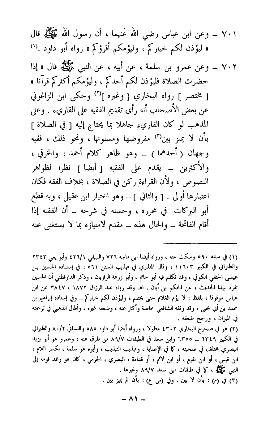 702 - وعن عمرو بن سلمة، عن أبيه، عن النبي - صَلَّى اللَّهُ عَلَيْهِ وَسَلَّمَ - قال: «إذا حضرت الصلاة فليؤذن لكم أحدكم، وليؤمكم أكثركم قرآنا» [مختصر] رواه البخاري [وغيره] ، وحكى ابن الزاغوني عن بعض الأصحاب أنه رأى تقديم الفقيه على القارئ. وعلى المذهب لو كان القارئ جاهلا بما يحتاج إليه [في الصلاة] بأن لا يميز بين مفروضها ومسنونها، ونحو ذلك، ففيه وجهان: (أحدهما) : - وهو ظاهر كلام أحمد، والخرقي، والأكثرين - يقدم على الفقيه [أيضا] نظرا لظواهر النصوص، ولأن القراءة ركن في الصلاة، بخلاف الفقه، فكان اعتبارها أولى. [والثاني] : - وهو اختيار ابن عقيل، وبه قطع أبو البركات في محرره، وحسنه في شرحه - أن الفقيه إذا أقام الفاتحة - والحال هذه - مقدم لامتيازه بما لا يستغنى عنه