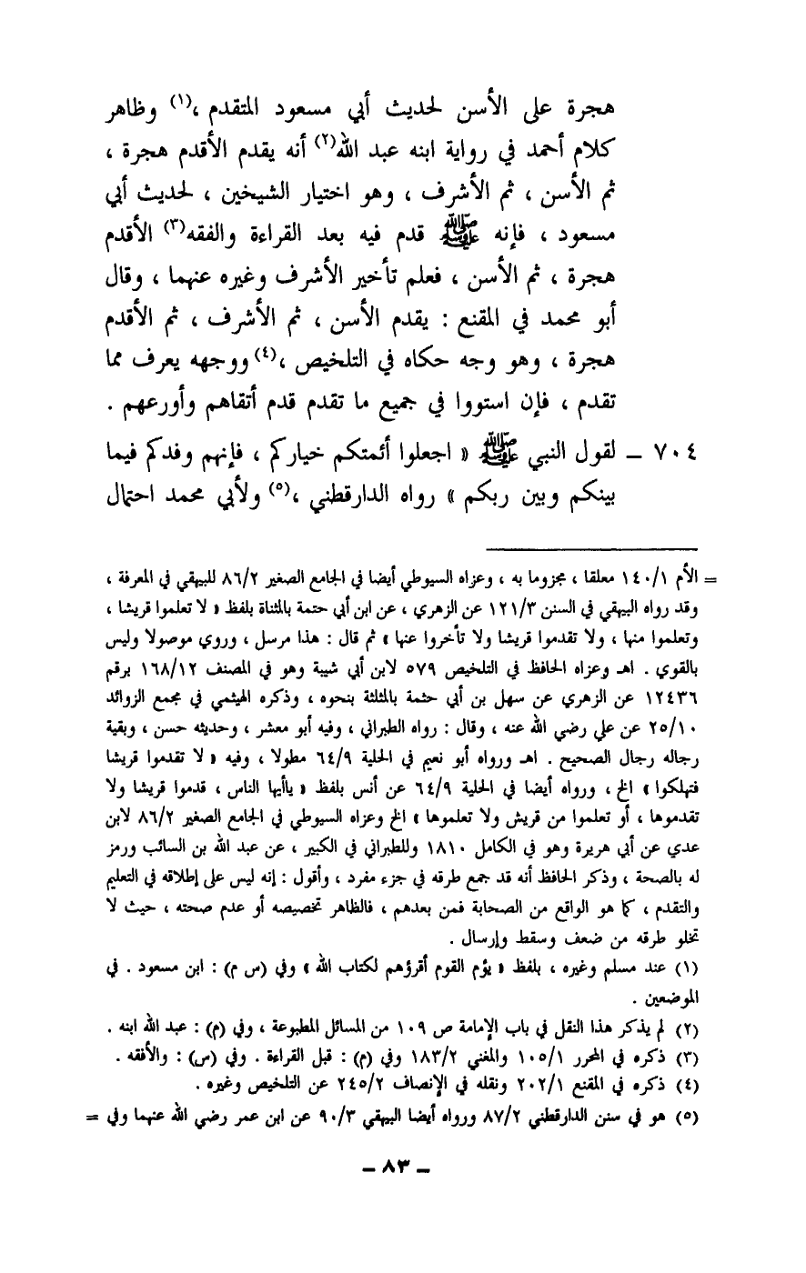هجرة على الأسن لحديث أبي مسعود المتقدم، وظاهر كلام أحمد في رواية ابنه عبد الله أنه يقدم الأقدم هجرة، ثم الأسن، ثم الأشرف، وهو اختيار الشيخين، لحديث أبي مسعود، فإنه - صَلَّى اللَّهُ عَلَيْهِ وَسَلَّمَ - قدم فيه بعد القراءة والفقه الأقدم هجرة، ثم الأسن، فعلم تأخير الأشرف وغيره عنهما، وقال أبو محمد في المقنع: يقدم الأسن، ثم الأشرف، ثم الأقدم هجرة، وهو وجه حكاه في التلخيص، ووجهه يعرف مما تقدم، فإن استووا في جميع ما تقدم قدم أتقاهم وأورعهم.