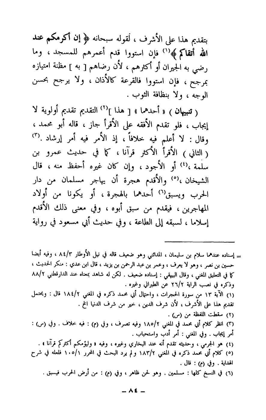 (تنبيهان) : «أحدهما» [هذا] التقديم تقديم أولوية لا إيجاب، فلو تقدم الأفقه على الأقرأ جاز، قاله أبو محمد، وقال: لا أعلم فيه خلافا، إذ الأمر فيه أمر إرشاد. (الثاني) : الأقرأ الأكثر قرآنا، كما في حديث عمرو بن سلمة، أو الأجود، وإن كان غير أحفظ منه، قال الشيخان، والأقدم هجرة أن يهاجر مسلمان من دار الحرب ويسبق أحدهما بالهجرة، أو يكونا من أولاد المهاجرين، فيقدم من سبق أبوه، وفي معنى ذلك الأقدم إسلاما، لسبقه إلى الطاعة، وفي حديث أبي مسعود في رواية