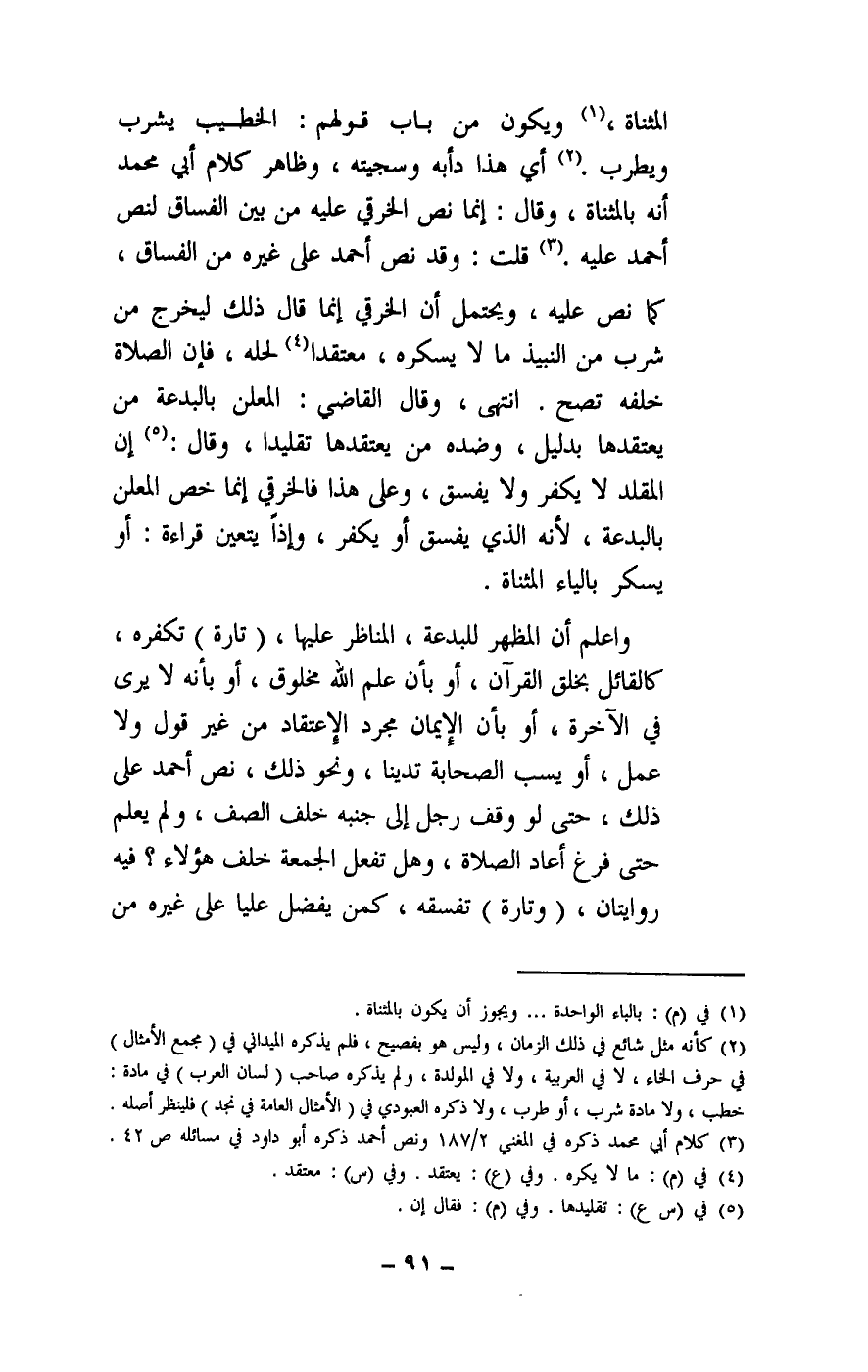 المثناة، ويكون من باب قولهم: الخطيب يشرب ويطرب. أي: هذا دأبه وسجيته، وظاهر كلام أبي محمد أنه بالمثناة، وقال: إنما نص الخرقي عليه من بين الفساق لنص أحمد عليه. قلت: وقد نص أحمد على غيره من الفساق. كما نص عليه، ويحتمل أن الخرقي إنما قال ذلك ليخرج من شرب من النبيذ ما لا يسكره، معتقدا لحله، فإن الصلاة خلفه تصح. انتهى، وقال القاضي: المعلن بالبدعة من يعتقدها بدليل، وضده من يعتقدها تقليدا، وقال: إن المقلد لا يكفر ولا يفسق، وعلى هذا فالخرقي إنما خص المعلن بالبدعة، لأنه الذي يفسق أو يكفر، وإذا يتعين قراءة: أو يسكر بالياء المثناة.