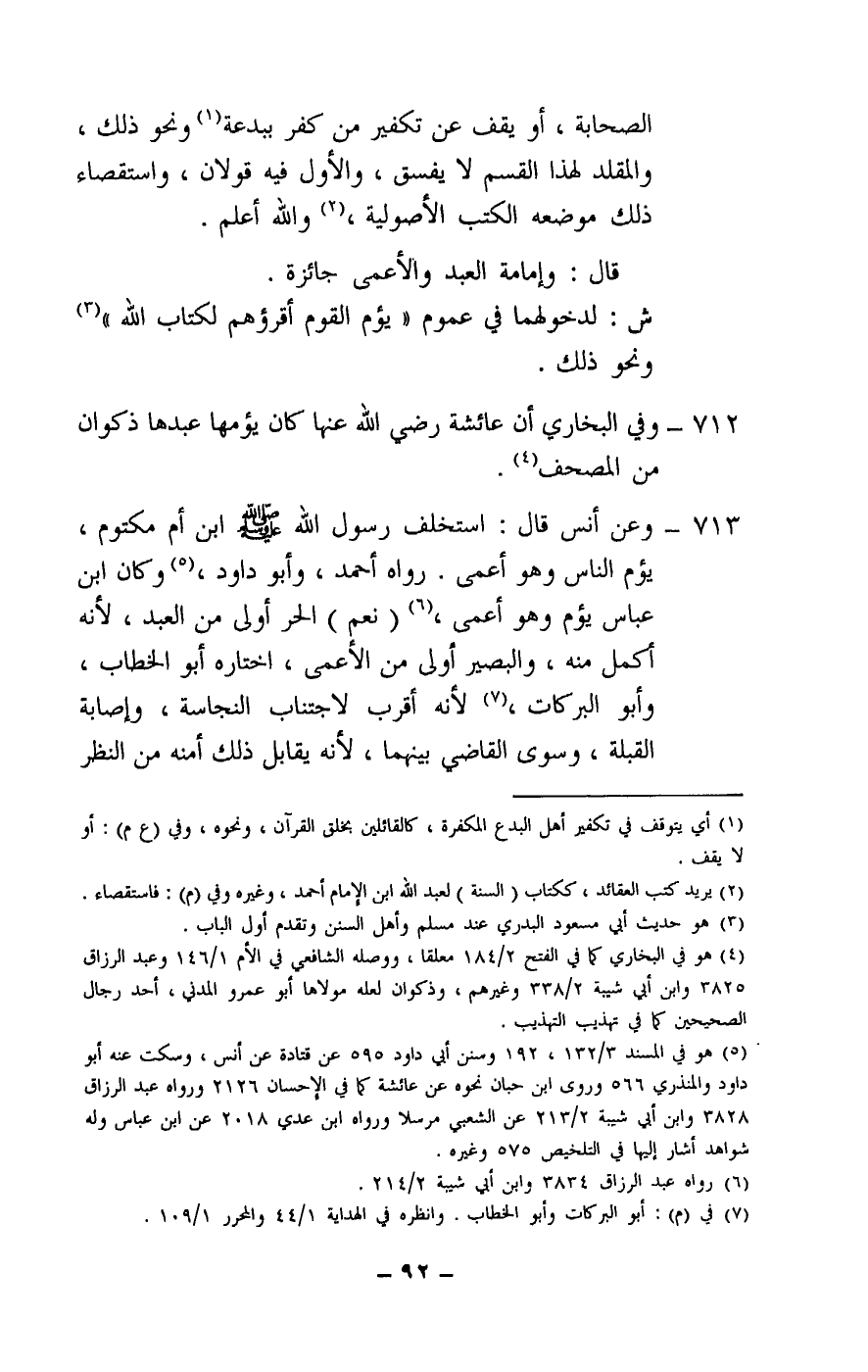 713 - وعن أنس، قال: «استخلف رسول الله - صَلَّى اللَّهُ عَلَيْهِ وَسَلَّمَ - ابن أم مكتوم، يؤم الناس وهو أعمى» . رواه أحمد، وأبو داود، وكان ابن عباس يؤم وهو أعمى، (نعم) الحر أولى من العبد، لأنه أكمل منه، والبصير أولى من الأعمى، اختاره أبو الخطاب، وأبو البركات، لأنه أقرب لاجتناب النجاسة، وإصابة القبلة، وسوى القاضي بينهما، لأنه يقابل ذلك أمنه من النظر