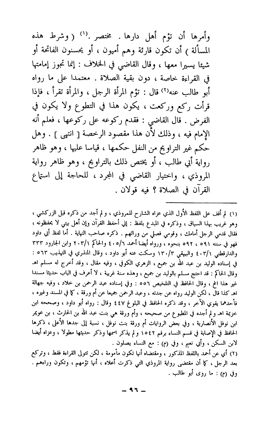 وأمرها أن تؤم أهل دارها. مختصر. (وشرط هذه المسألة) أن تكون قارئة وهم أميون، أو يحسنون الفاتحة أو شيئا يسيرا معها. وقال القاضي في الخلاف: إنما تجوز إمامتها في القراءة خاصة، دون بقية الصلاة. معتمدا على ما رواه أبو طالب عنه، قال: تؤم المرأة الرجل، والمرأة تقرأ، فإذا قرأت ركع وركعت، يكون هذا في التطوع ولا يكون في الفرض. قال القاضي: فقدم ركوعه على ركوعها، فعلم أنه الإمام فيه، وذلك لأن هذا مقصود الرخصة [انتهى] . وهل حكمي غير التراويح من النفل حكمها، قياسا عليها، وهو ظاهر رواية أبي طالب، أو يختص ذلك بالتراويح، وهو ظاهر رواية المروذي، واختيار القاضي في المجرد، للحاجة إلى استماع القرآن في الصلاة؟ فيه قولان.