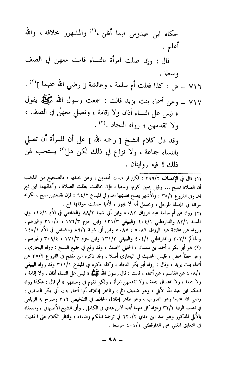 717 - وعن أسماء بنت يزيد، قالت: سمعت رسول الله - صَلَّى اللَّهُ عَلَيْهِ وَسَلَّمَ - يقول: «ليس على النساء أذان ولا إقامة، وتصلي معهن في الصف، ولا تقدمهن» رواه النجاد.