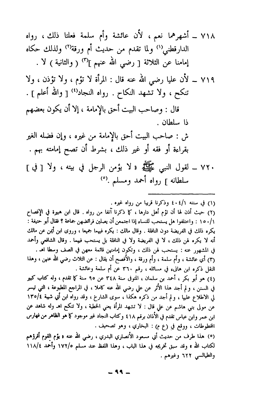 720 - لقول النبي - صَلَّى اللَّهُ عَلَيْهِ وَسَلَّمَ -: «لا يؤمن الرجل في بيته، ولا [في] سلطانه] » رواه أحمد ومسلم.