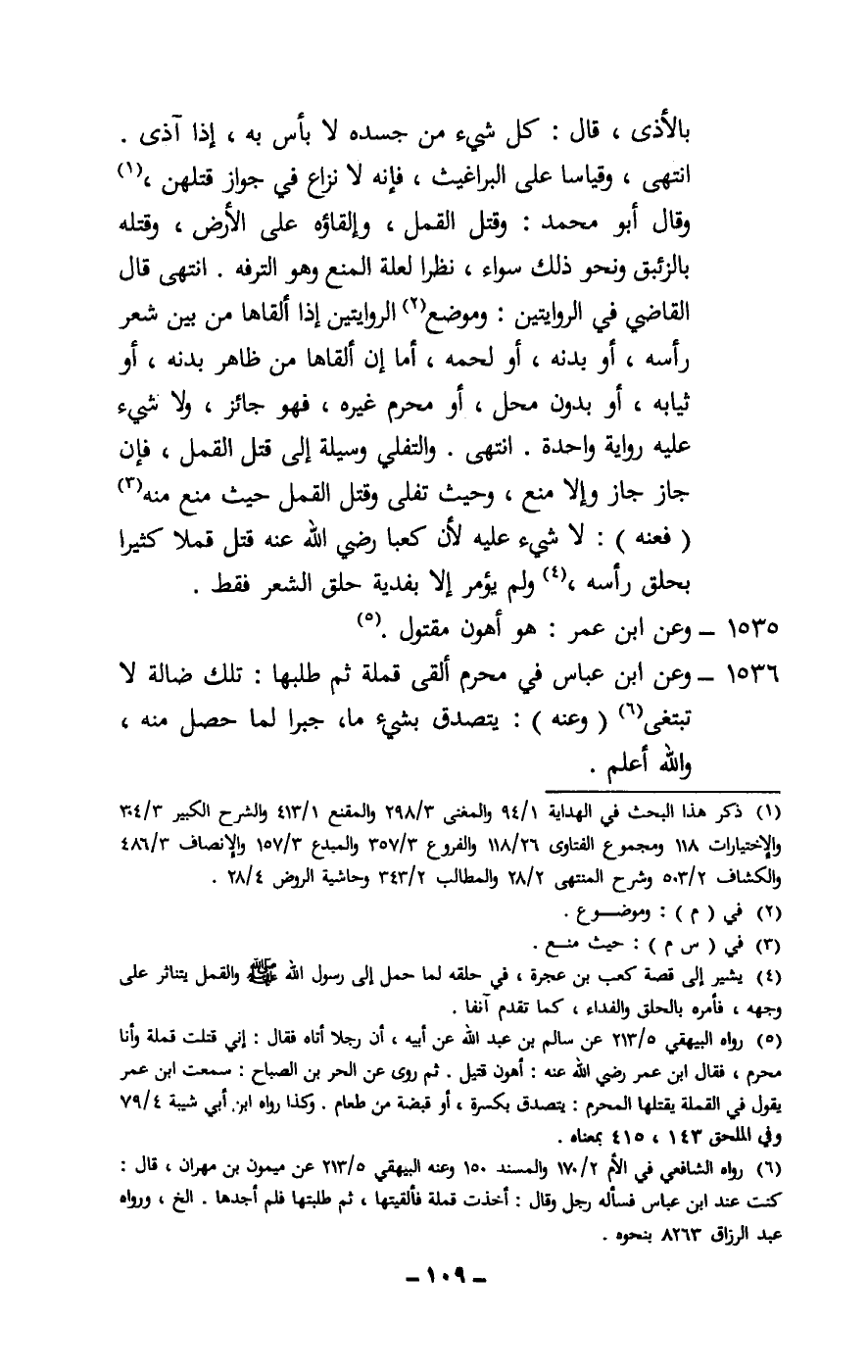 بالأذى، قال: كل شيء من جسده لا بأس به، إذا آذى انتهى، وقياسا على البراغيث، فإنه لا نزاع في جواز قتلهن، وقال أبو محمد: وقتل القمل، وإلقاؤه على الأرض، وقتله بالزئبق ونحو ذلك سواء، نظرا لعلة المنع وهو الترفه. انتهى.