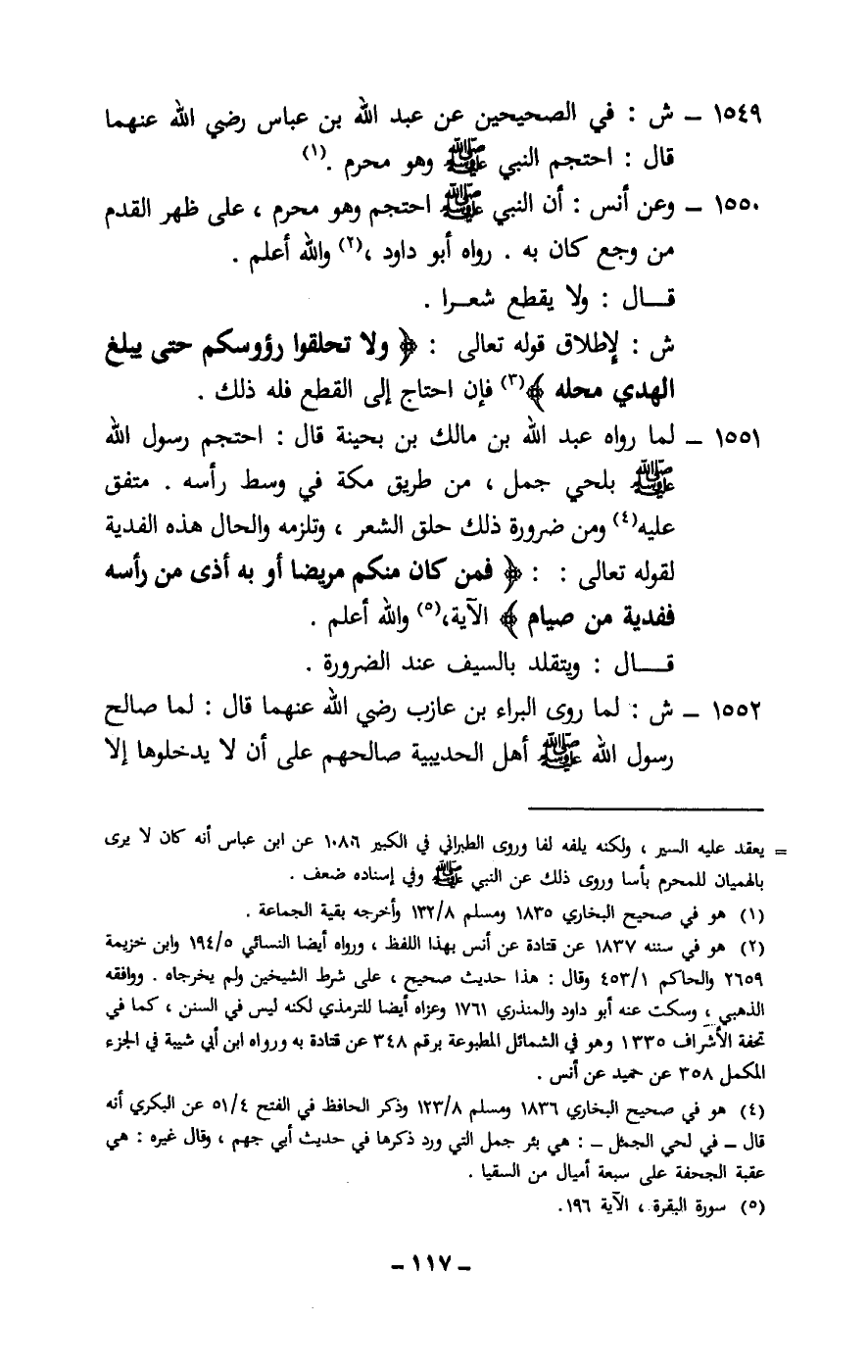 1549 - ش: في الصحيحين عن عبد الله بن عباس - رَضِيَ اللَّهُ عَنْهُمَا -. «قال: احتجم النبي - صَلَّى اللَّهُ عَلَيْهِ وَسَلَّمَ - وهو محرم.»
