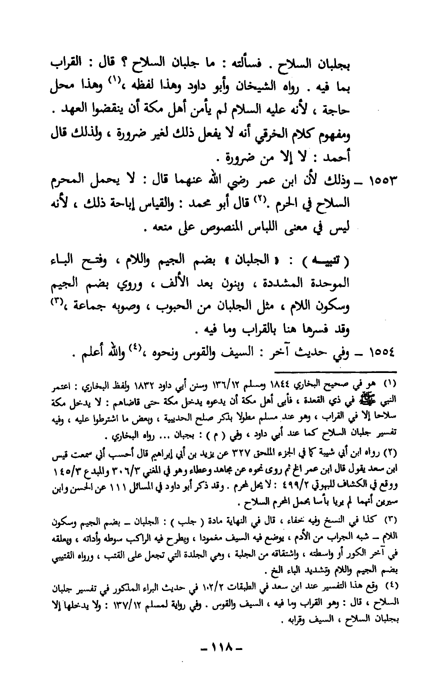 بجلبان السلاح. فسألته: ما جلبان السلاح؟ قال: القراب بما فيه.» رواه الشيخان، وأبو داود وهذا لفظه، وهذا محل حاجة، لأنه - عَلَيْهِ السَّلَامُ - لم يأمن أهل مكة أن ينقضوا العهد. ومفهوم كلام الخرقي أنه لا يفعل ذلك لغير ضرورة، ولذلك قال أحمد: لا إلا من ضرورة.