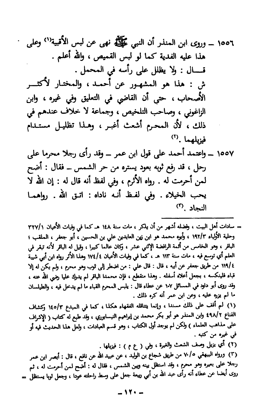 1557 - واعتمد أحمد على قول ابن عمر - وقد رأى رجلا محرما على رحل، قد رفع ثوبه بعود يستره من حر الشمس - فقال: أضح لمن أحرمت له، رواه الأثرم، وفي لفظ أنه قال له: إن الله لا يحب الخيلاء. وفي لفظ أنه ناداه: اتق الله. رواهما النجاد.