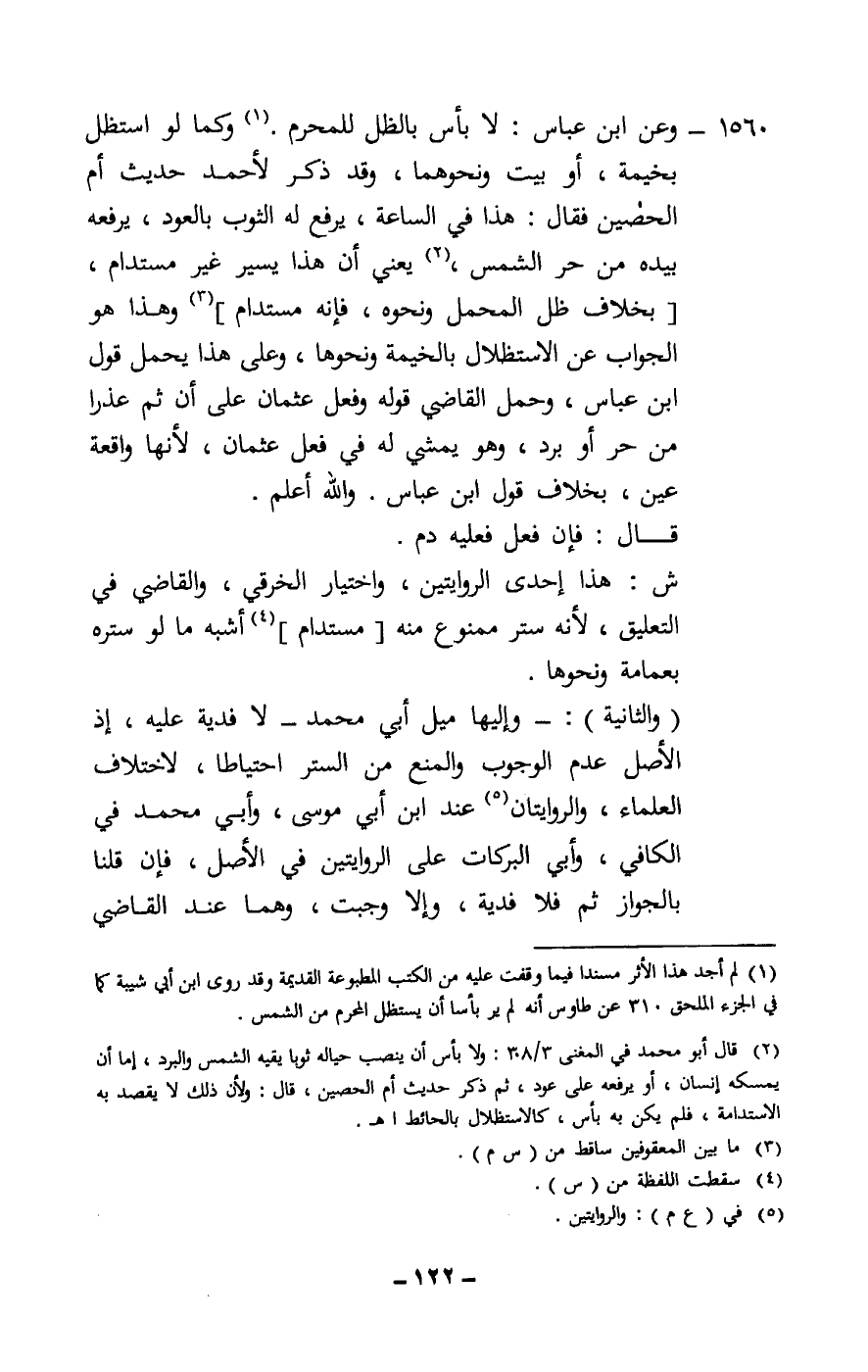 1560 - وعن ابن عباس: لا بأس بالظل للمحرم. وكما لو استظل بخيمة، أو بيت ونحوهما، وقد ذكر لأحمد حديث أم الحصين فقال: هذا في الساعة، يرفع له الثوب بالعود، يرفعه بيده من حر الشمس، يعني أن هذا يسير غير مستدام، [بخلاف ظل المحمل ونحوه، فإنه مستدام] وهذا هو الجواب عن الاستظلال بالخيمة ونحوها، وعلى هذا يحمل قول ابن عباس، وحمل القاضي قوله وفعل عثمان على أن ثم عذرا من حر أو برد، وهو يمشي له في فعل عثمان، لأنها واقعة عين، بخلاف قول ابن عباس. والله أعلم.