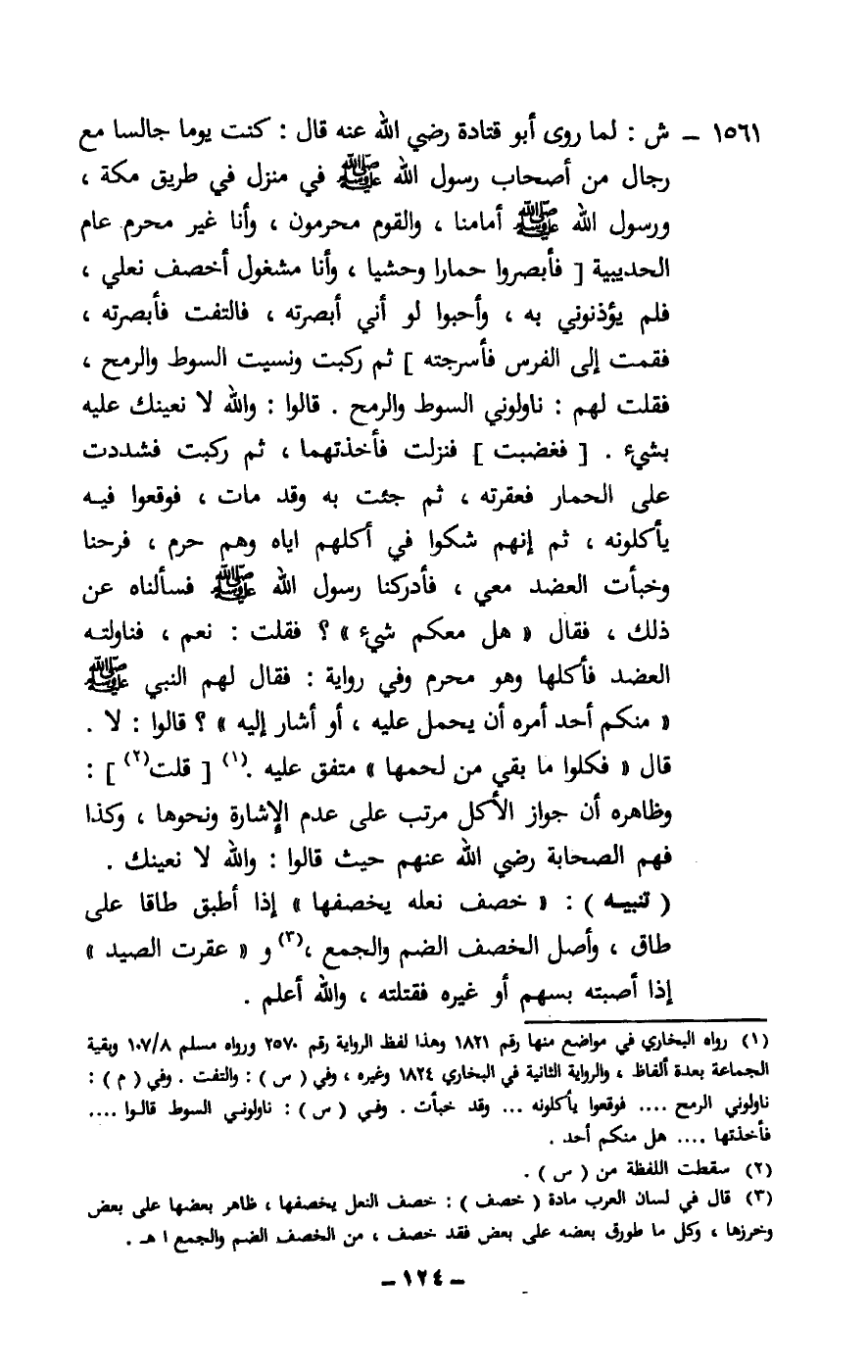 1561 - ش: لما «روى أبو قتادة - رَضِيَ اللَّهُ عَنْهُ - قال: كنت يوما جالسا مع رجال من أصحاب رسول الله - صَلَّى اللَّهُ عَلَيْهِ وَسَلَّمَ - في منزل في طريق مكة، ورسول الله - صَلَّى اللَّهُ عَلَيْهِ وَسَلَّمَ - أمامنا، والقوم محرمون، وأنا غير محرم عام الحديبية [فأبصروا حمارا وحشيا، وأنا مشغول أخصف نعلي، فلم يؤذنوني به، وأحبوا لو أني أبصرته، فالتفت فأبصرته، فقمت إلى الفرس فأسرجته ثم ركبت ونسيت السوط والرمح، فقلت لهم: ناولوني السوط والرمح. قالوا: والله لا نعينك عليه بشيء. [فغضبت] فنزلت فأخذتهما، ثم ركبت فشددت على الحمار فعقرته، ثم جئت به وقد مات، فوقعوا فيه يأكلونه، ثم إنهم شكوا في أكلهم إياه وهم حرم، فرحنا وخبأت العضد معي، فأدركنا رسول الله - صَلَّى اللَّهُ عَلَيْهِ وَسَلَّمَ - فسألناه عن ذلك، فقال «هل معكم شيء» ؟ فقلت: نعم، فناولته العضد فأكلها وهو محرم وفي رواية: فقال لهم النبي - صَلَّى اللَّهُ عَلَيْهِ وَسَلَّمَ - «منكم أحد أمره أن يحمل عليه، أو أشار إليه» ؟ قالوا: لا. قال «فكلوا ما بقي من لحمها» متفق عليه.