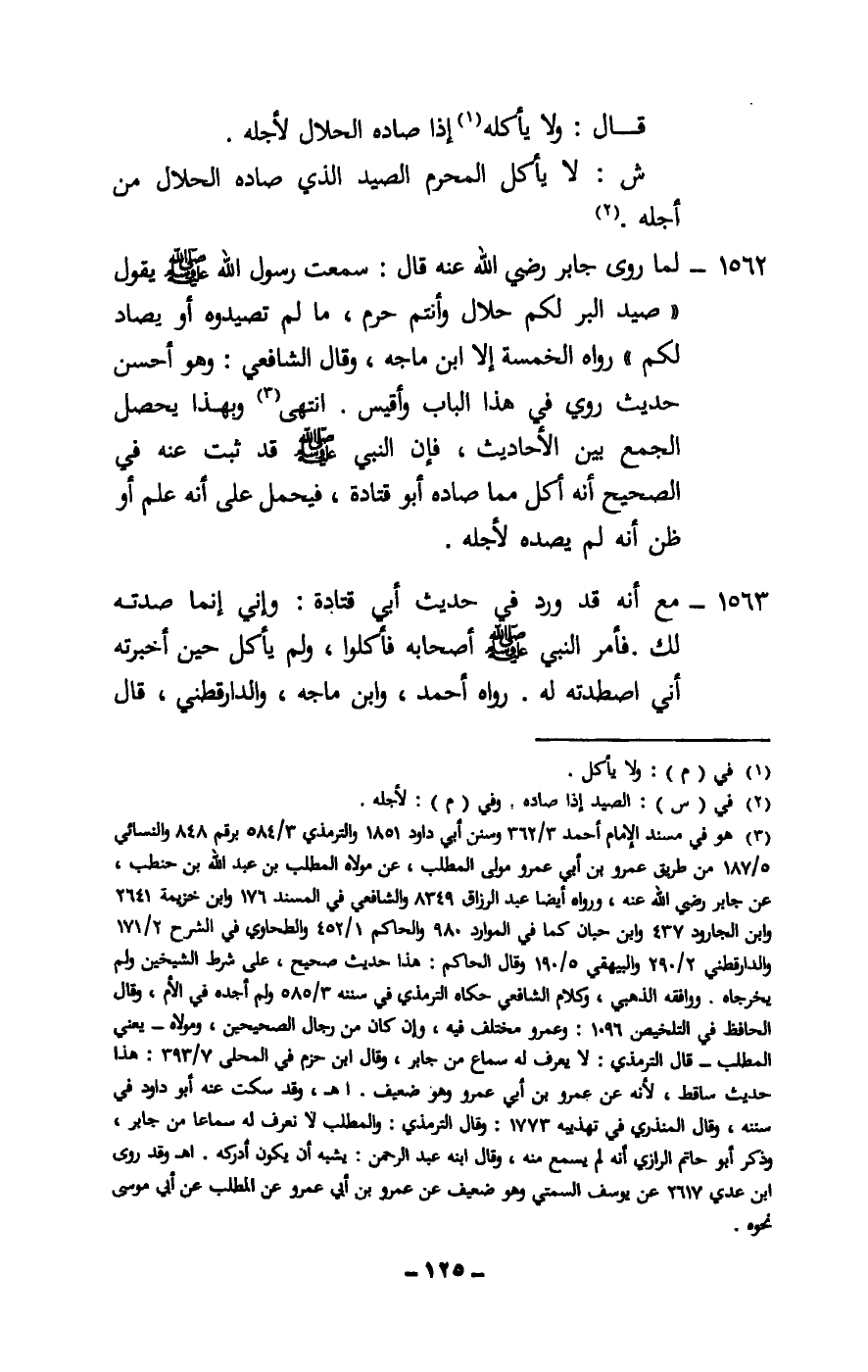 1562 - لما روى جابر - رَضِيَ اللَّهُ عَنْهُ - قال: سمعت رسول الله - صَلَّى اللَّهُ عَلَيْهِ وَسَلَّمَ - يقول «صيد البر لكم حلال وأنتم حرم، ما لم تصيدوه أو يصاد لكم» رواه الخمسة إلا ابن ماجه، وقال الشافعي: وهو أحسن حديث روي في هذا الباب وأقيس. انتهى.