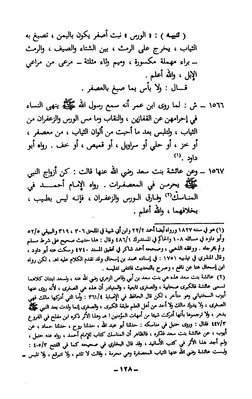 1567 - وعن عائشة بنت سعد - رَضِيَ اللَّهُ عَنْهَا - قالت: كن أزواج النبي - صَلَّى اللَّهُ عَلَيْهِ وَسَلَّمَ - يحرمن في المعصفرات. رواه الإمام أحمد في المناسك وفارق الورس والزعفران، فإنه ليس بطيب، بخلافهما، والله أعلم.