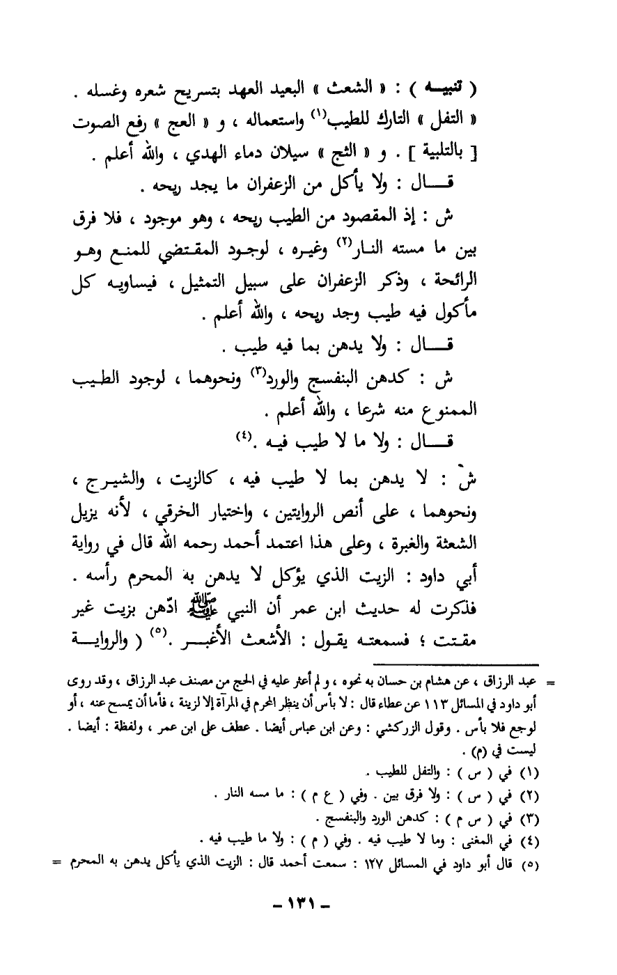 ش: لا يدهن بما لا طيب فيه، كالزيت، والشيرج، ونحوهما، على أنص الروايتين، واختيار الخرقي، لأنه يزيل الشعثة والغبرة، وعلى هذا اعتمد أحمد - رَحِمَهُ اللَّهُ - قال في رواية أبي داود: الزيت الذي يؤكل لا يدهن به المحرم رأسه. فذكرت له حديث ابن عمر «أن النبي - صَلَّى اللَّهُ عَلَيْهِ وَسَلَّمَ - ادهن بزيت غير مقتت؛» فسمعته يقول: الأشعث الأغبر. (والرواية