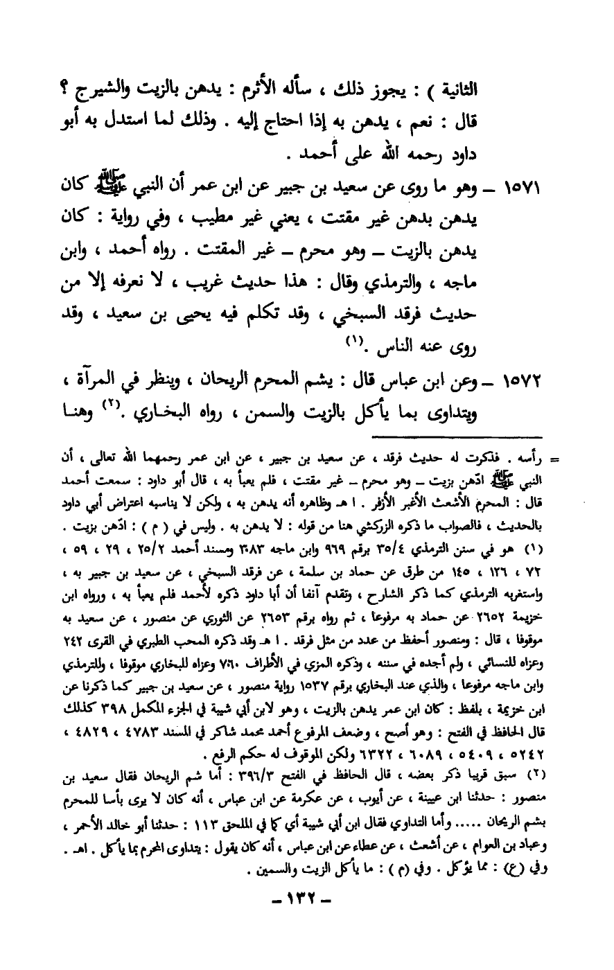 1571 - وهو ما روى عن سعيد بن جبير عن ابن عمر «أن النبي - صَلَّى اللَّهُ عَلَيْهِ وَسَلَّمَ - كان يدهن بدهن غير مقتت» ، يعني غير مطيب، وفي رواية: «كان يدهن بالزيت - وهو محرم - غير المقتت» . رواه أحمد، وابن ماجه، والترمذي وقال: هذا حديث غريب، لا نعرفه إلا من حديث فرقد السبخي، وقد تكلم فيه يحيى بن سعيد، وقد روى عنه الناس.