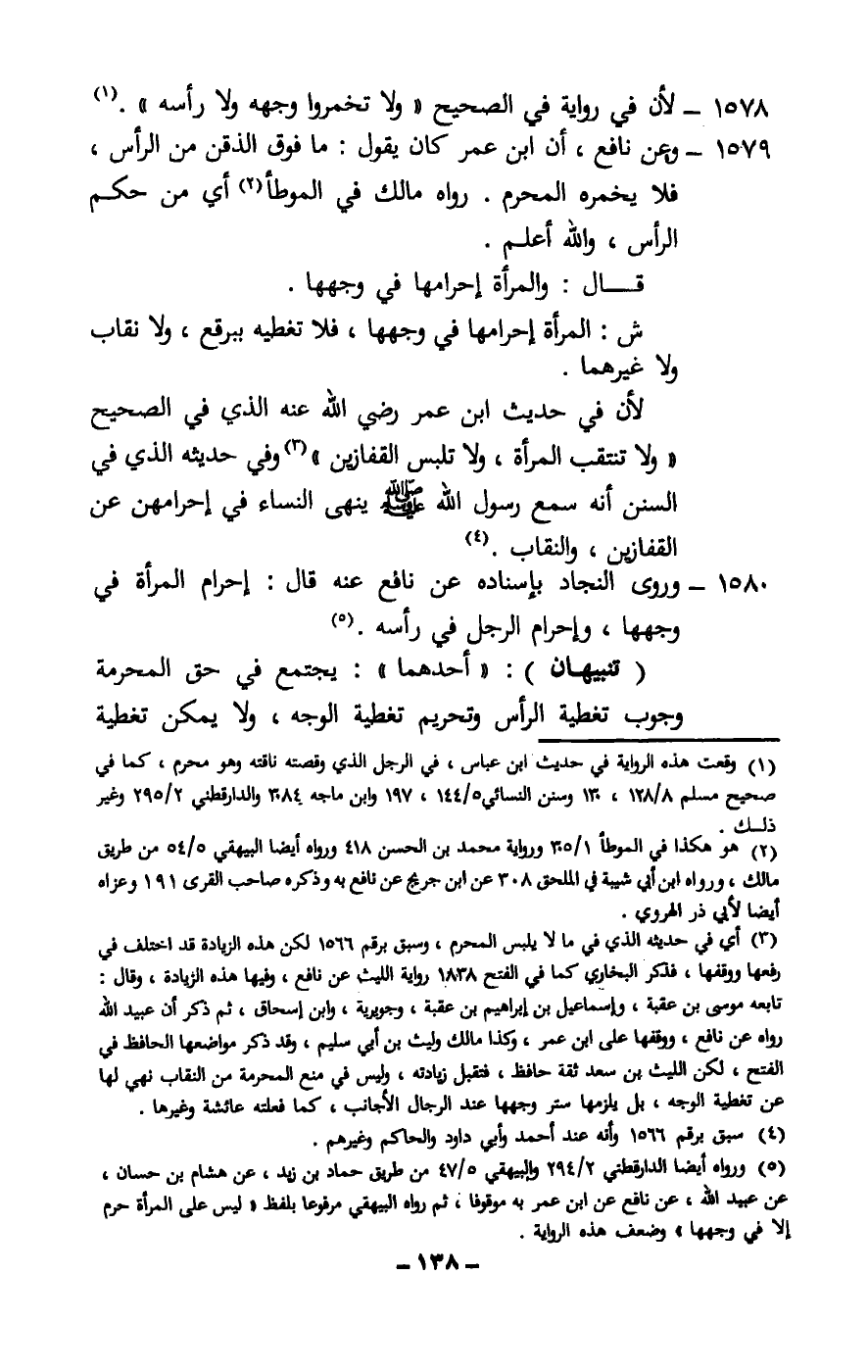 1580 - وروى النجاد بإسناده عن نافع عنه قال: «إحرام المرأة في وجهها، وإحرام الرجل في رأسه» .