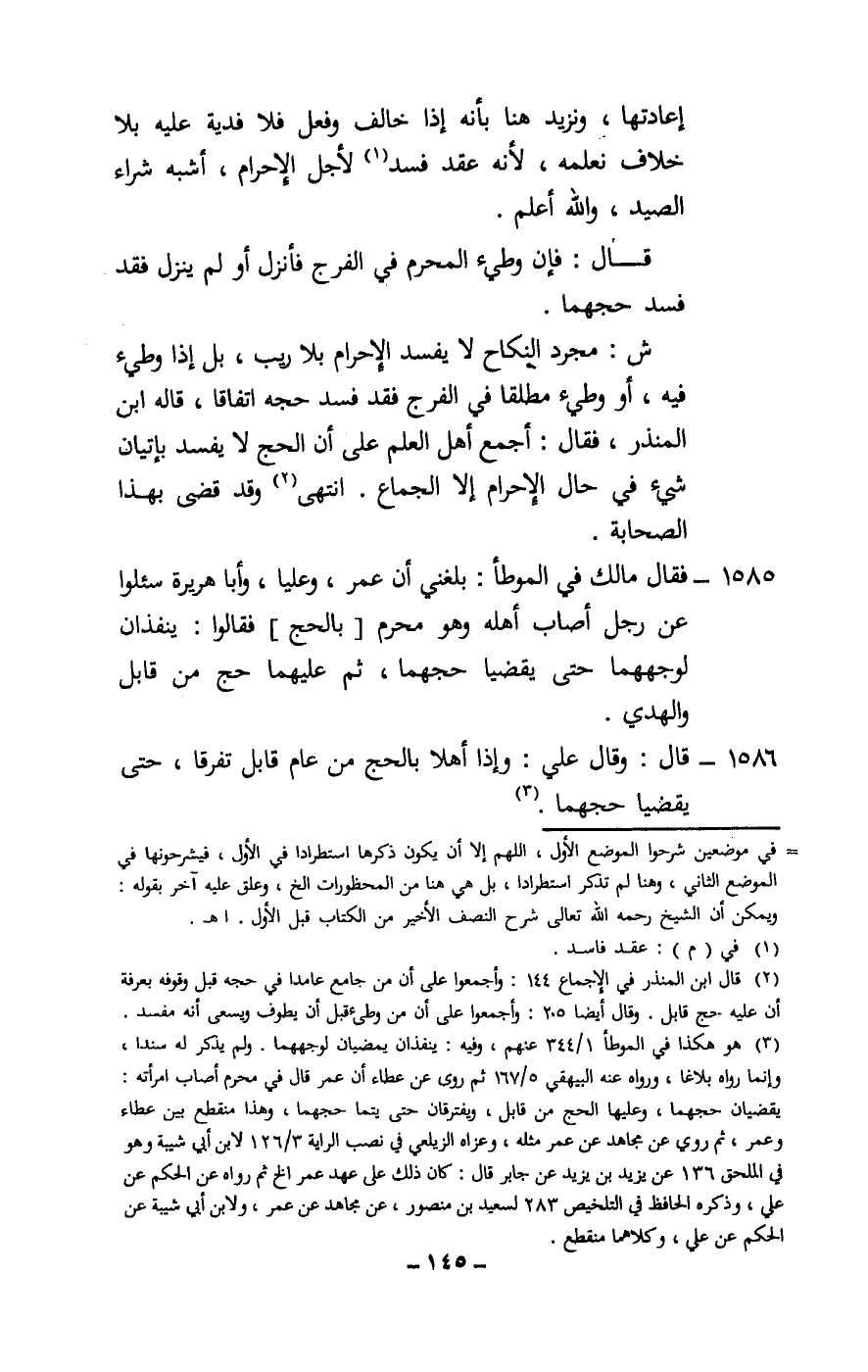 1585 - فقال مالك في الموطأ: بلغني أن عمر، وعليا، وأبا هريرة سئلوا عن رجل أصاب أهله وهو محرم [بالحج] فقالوا: ينفذان لوجههما حتى يقضيا حجهما، ثم عليهما حج من قابل والهدي.