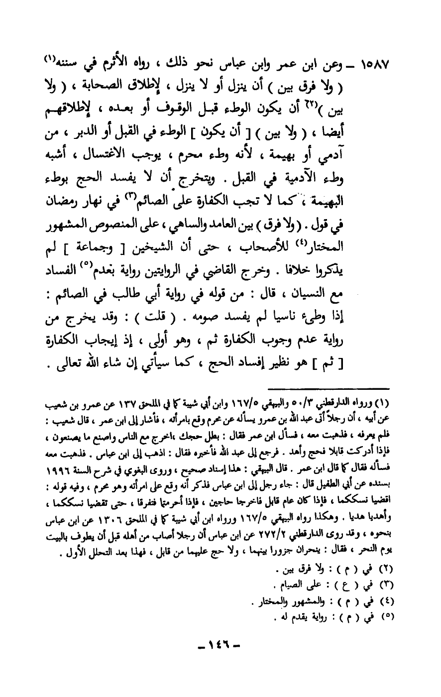 1587 - وعن ابن عمر وابن عباس نحو ذلك، رواه الأثرم في سننه (ولا فرق بين) أن ينزل أو لا ينزل، لإطلاق الصحابة، (ولا بين) أن يكون الوطء قبل الوقوف أو بعده، لإطلاقهم أيضا، (ولا بين) [أن يكون] الوطء قبل الوقوف أو بعده، لإطلاقهم أيضا، (ولا بين) [أن يكون] الوطء في القبل أو الدبر، من آدمي أو بهيمة، لأنه وطء محرم، يجب الاغتسال، أشبه وطء الآدمية في القبل، يتخرج أن لا يفسد الحج بوطء البهيمة، كما لا تجب الكفارة على الصائم في نهار رمضان في قول. (ولا فرق: بين العامد والساهي، على المنصوص المشهور المختار للأصحاب، حتى أن الشيخين [وجماعة] لم يذكروا خلافا. وخرج القاضي في الروايتين رواية بعدم الفساد مع النسيان، قال: من قوله في رواية أبي طالب في الصائم: إذا وطىء ناسيا لم يفسد صومه.