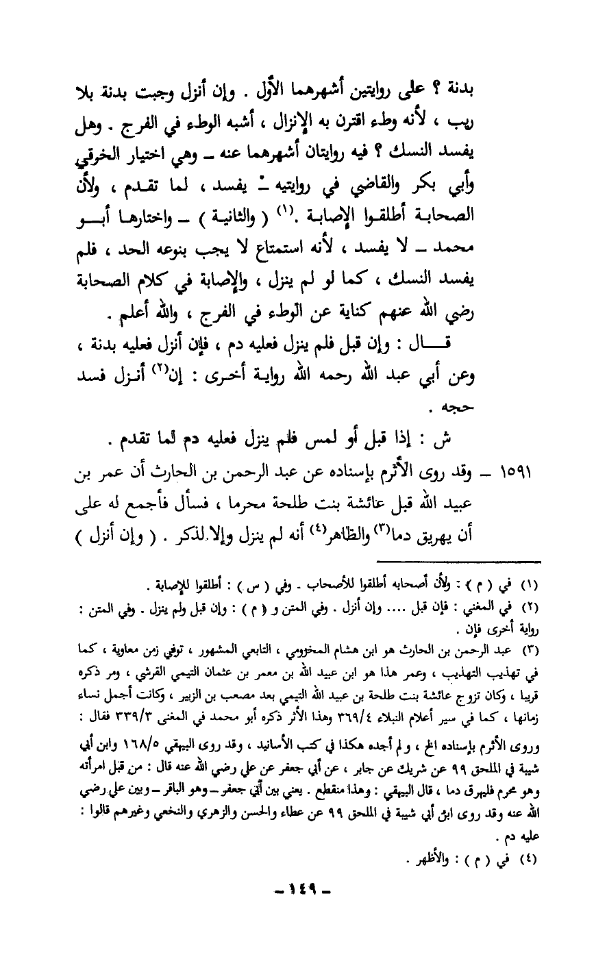 (والثانية) - واختارها أبو محمد - لا يفسد، لأنه استمتاع لا يجب بنوعه الحد، فلم يفسد النسك، كما لو لم ينزل، والإصابة في كلام الصحابة - رَضِيَ اللَّهُ عَنْهُمْ - كناية عن الوطء في الفرج، والله أعلم.