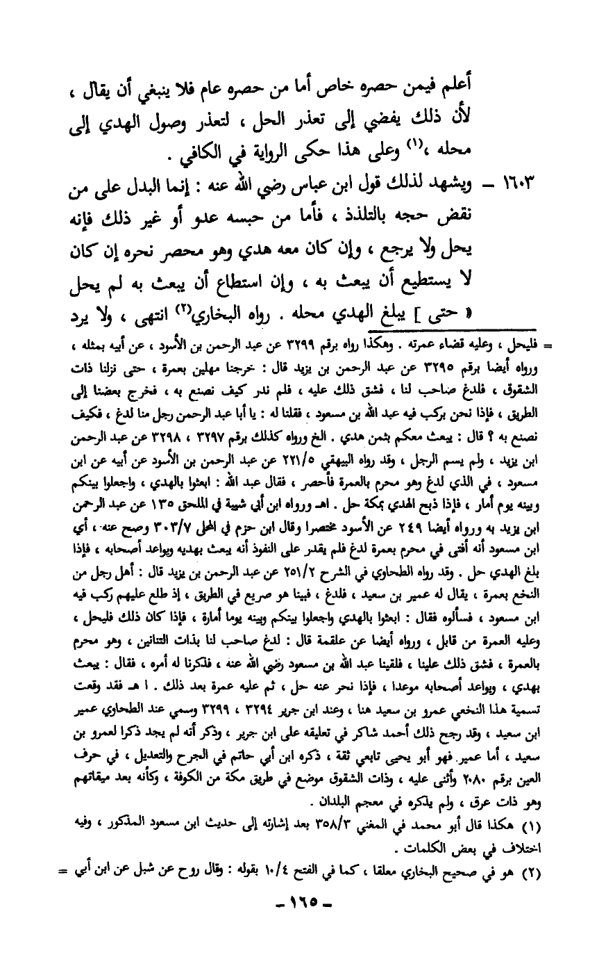 1603 - ويشهد لذلك قول ابن عباس - رَضِيَ اللَّهُ عَنْهُ -: إنما البدل على من نقض حجه بالتلذذ، فأما من حبسه عدو أو غير ذلك فإنه يحل ولا يرجع، وإن كان معه هدي وهو محصر نحره إن كان لا يستطيع أن يبعث به، وإن استطاع أن يبعث به لم يحل حتى يبلغ الهدي محله. رواه البخاري انتهى، ولا يرد